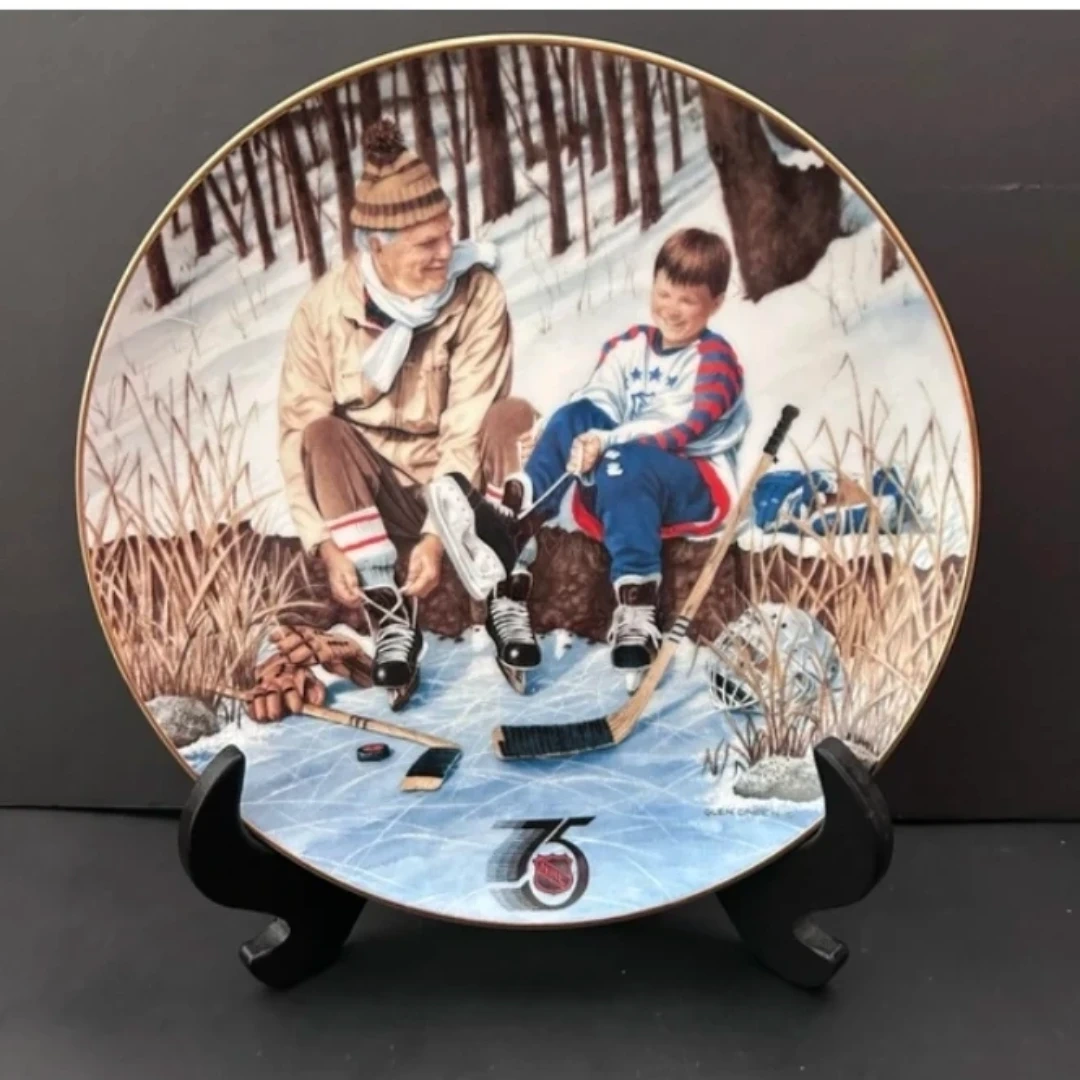This limited edition collector plate, "First Ice", beautifully depicts a grandfather and grandson tying skates for a day on the ice. It's crafted with exquisite detail. A wonderful piece for any hockey or Americana art enthusiast!
