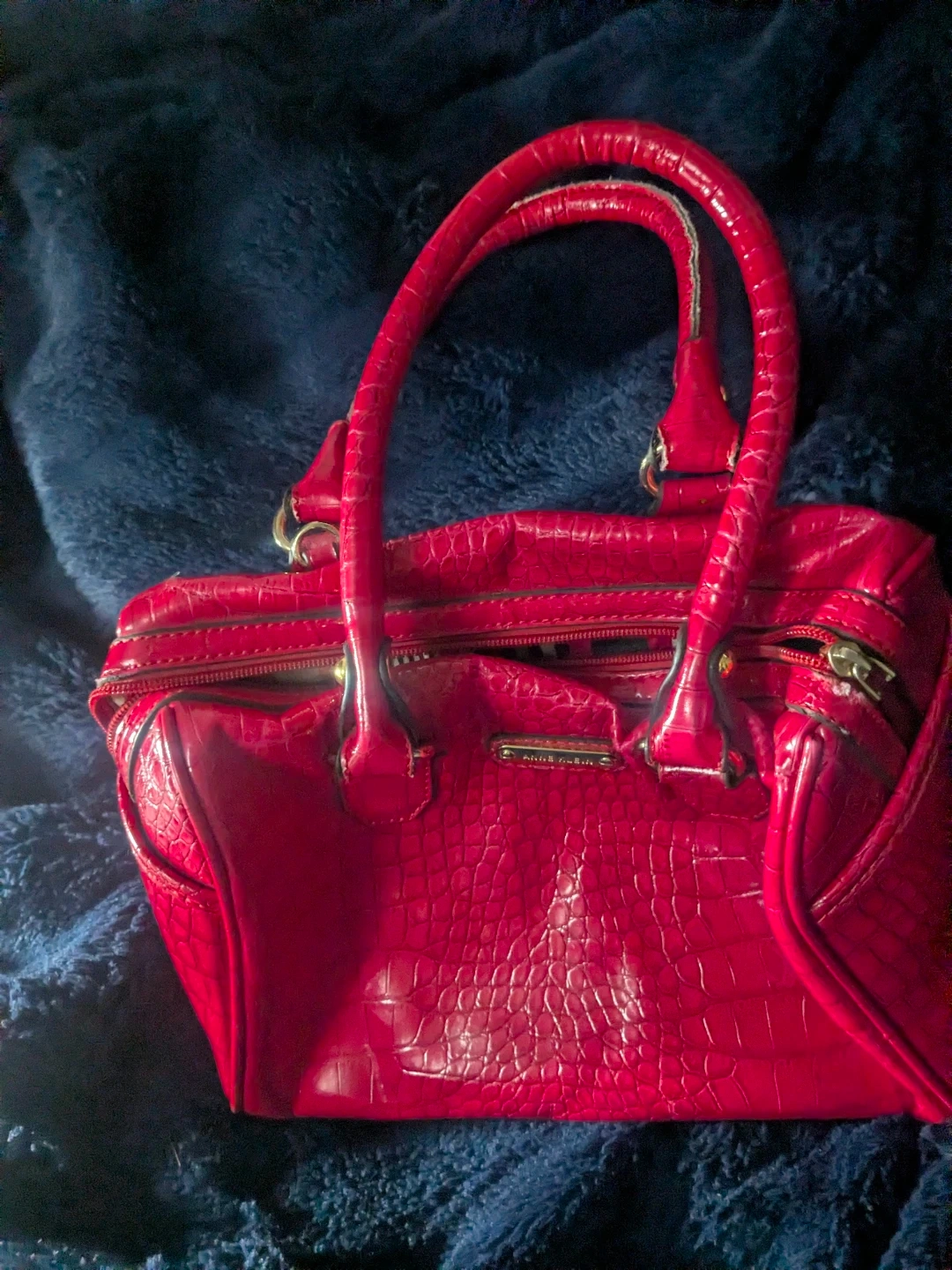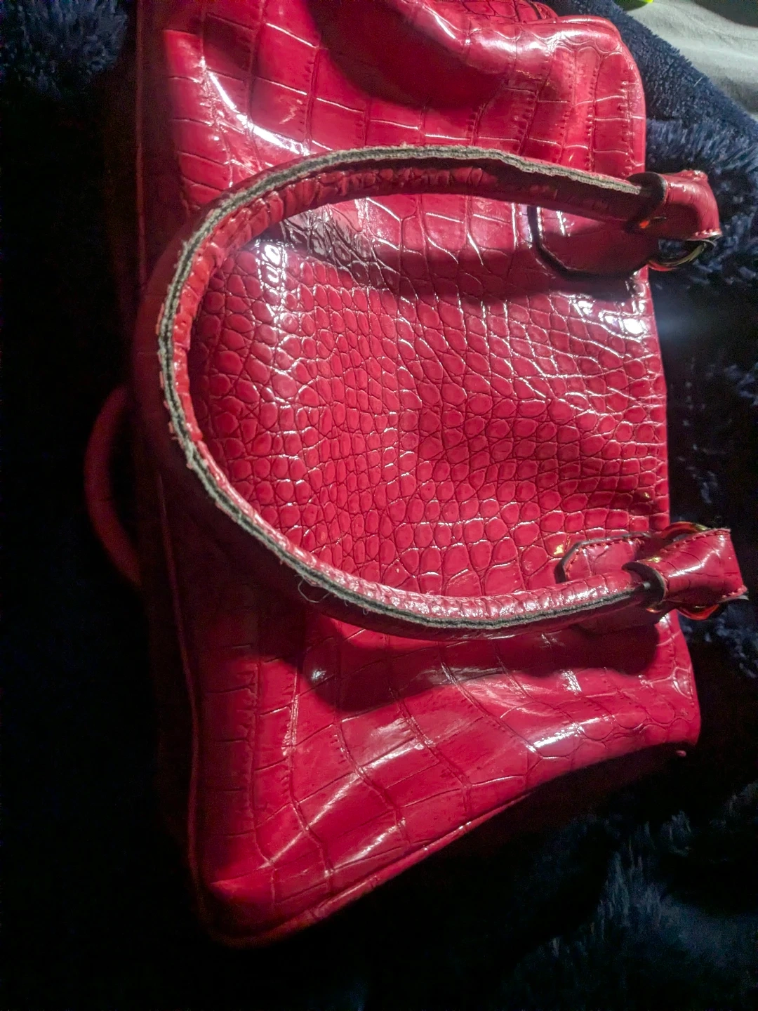 This red handbag has a faux crocodile finish. It's made of faux leather and features a zip closure. It's a stylish accessory for everyday use.