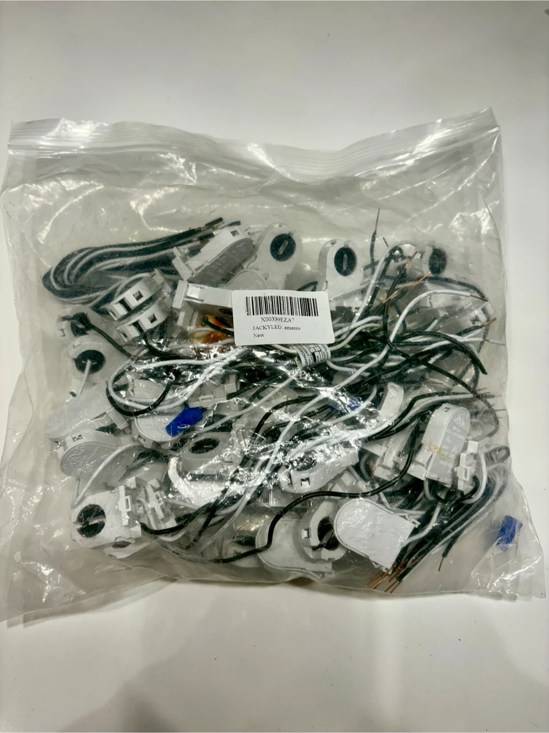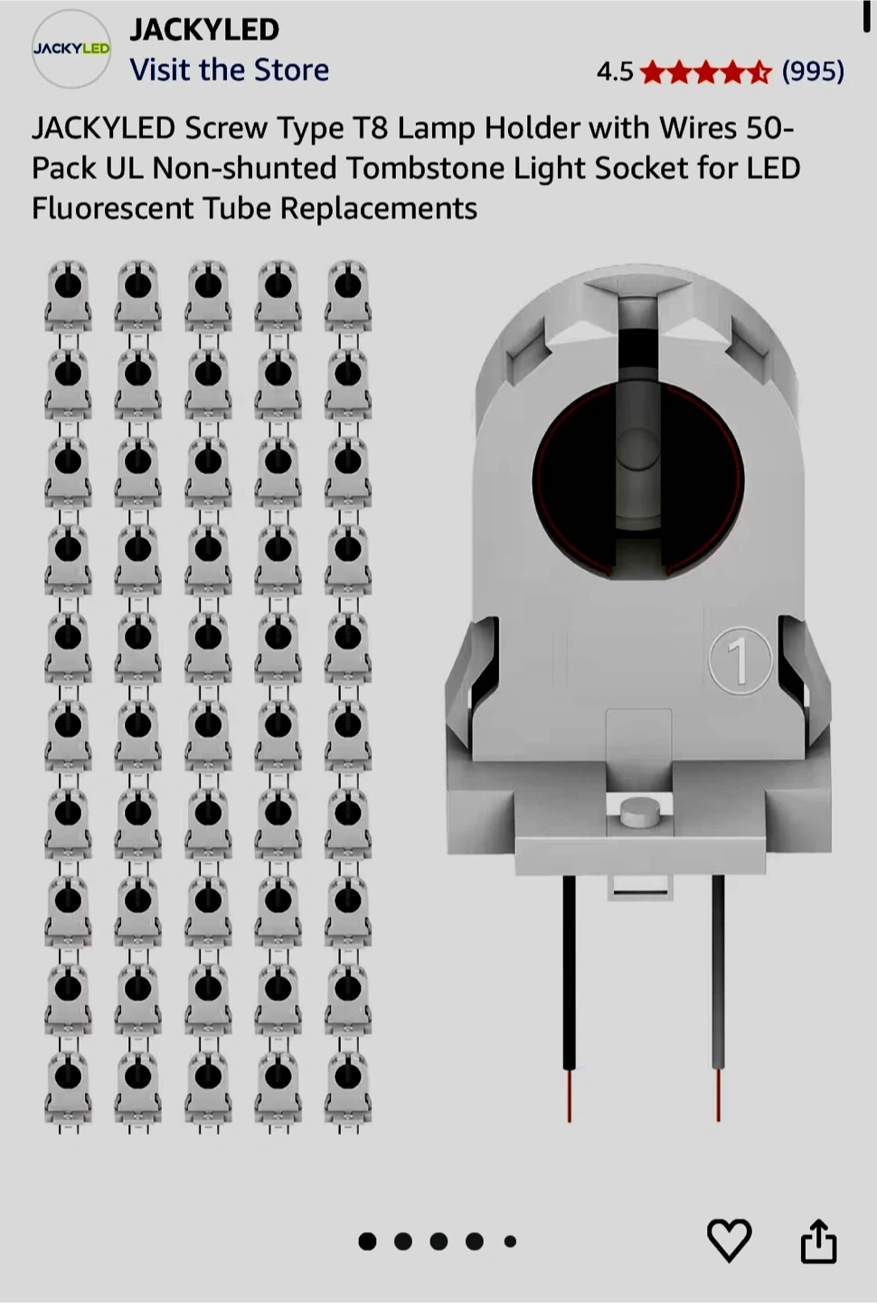 This is a 50-pack of JACKYLED screw-type T8 lamp holders with wires. Used some but not many. They are non-shunted tombstone light sockets designed for LED fluorescent tube replacements. This pack is great for upgrading multiple light fixtures to LED technology.