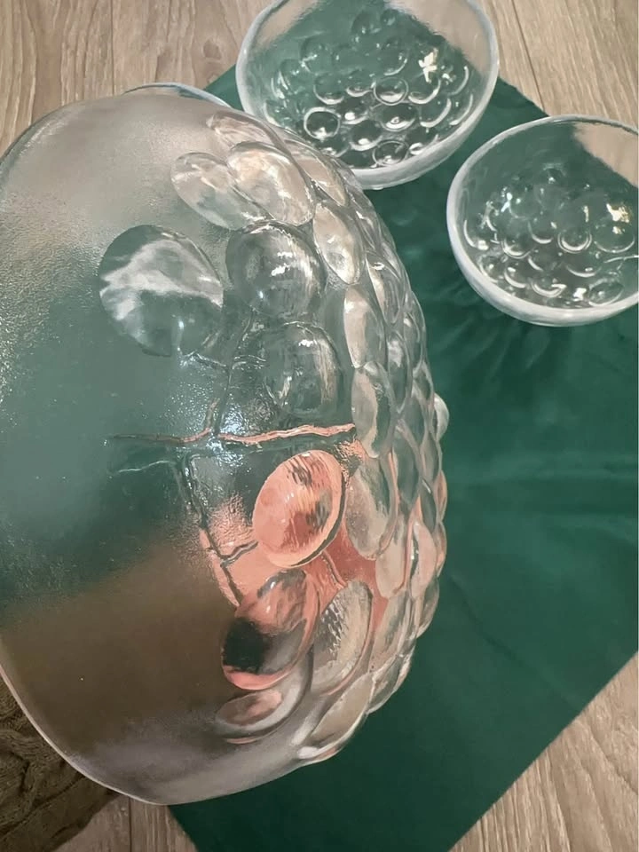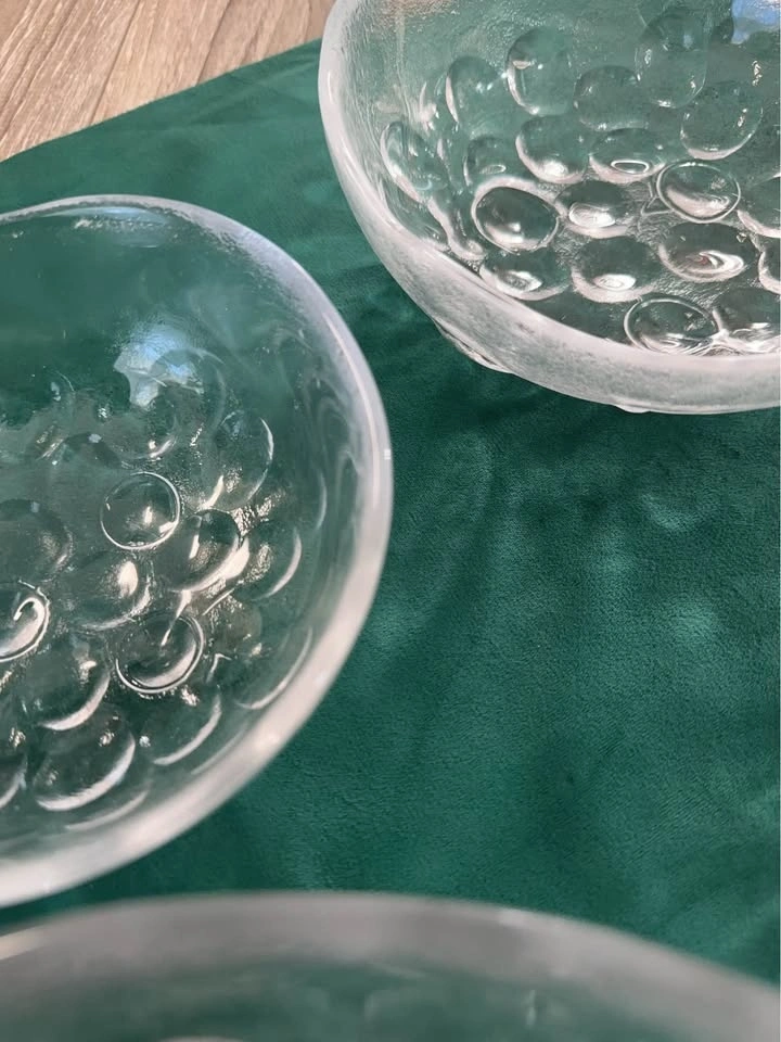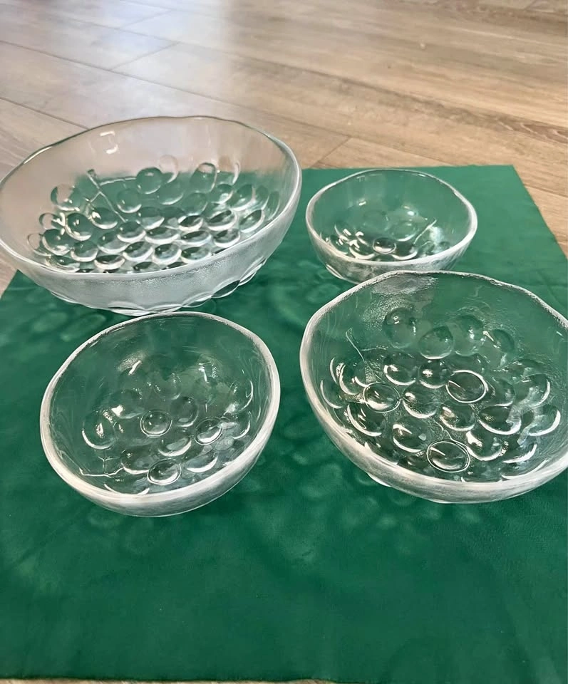 A stunning piece of Finnish design history. This is an authentic Iittala "Gaissa" series set, designed by the legendary Tapio Wirkkala. The Design: Famous "Ice Age" / "Glacier" textured base with beautifully organic, wavy rims. Not perfectly circular, capturing the raw beauty of melting ice. Quality: Heavy, premium lead-free crystal with incredible clarity and light refraction. Condition: Mint Condition. No chips, cracks, or clouding. Includes: 1 Large Serving Bowl + 3 Individual Bowls. Collector's Note: Perfect for MCM (Mid-Century Modern) lovers and Scandinavian glass collectors.