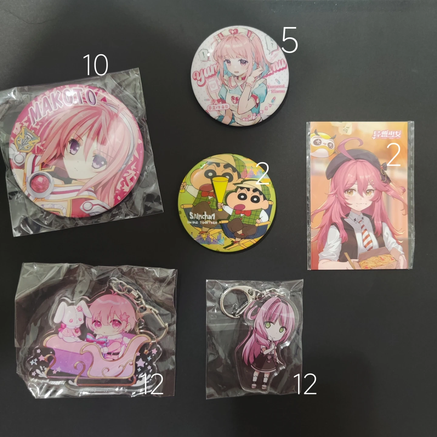This lot includes a 'Makoto' character button, a 'Yumemi Riamu' button, a Shin-chan button, and two anime character keychains. Designs vary.