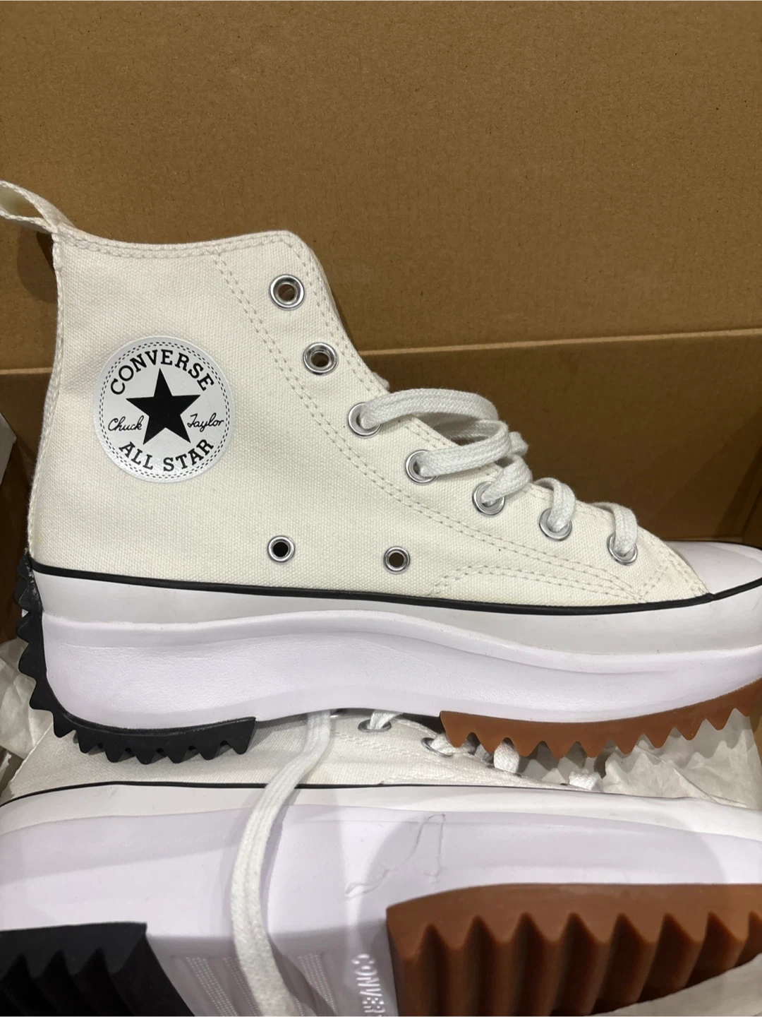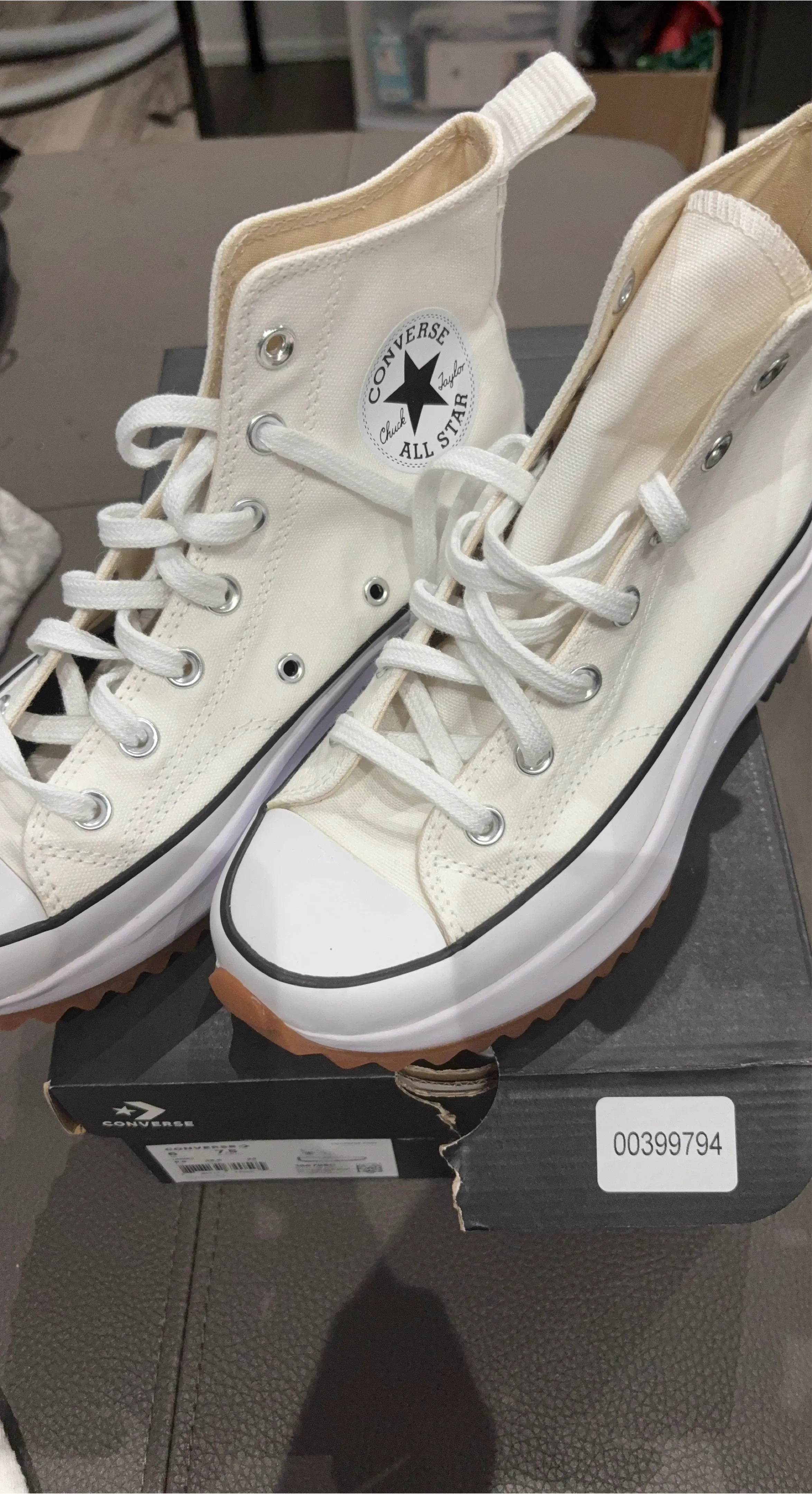 Converse Run Star Hike Hi sneakers in white, black, and gum. These high-top canvas shoes have a platform sole and a rugged outsole. UNISEX MENS SIZE 6 WOMENS SIZE 7.5