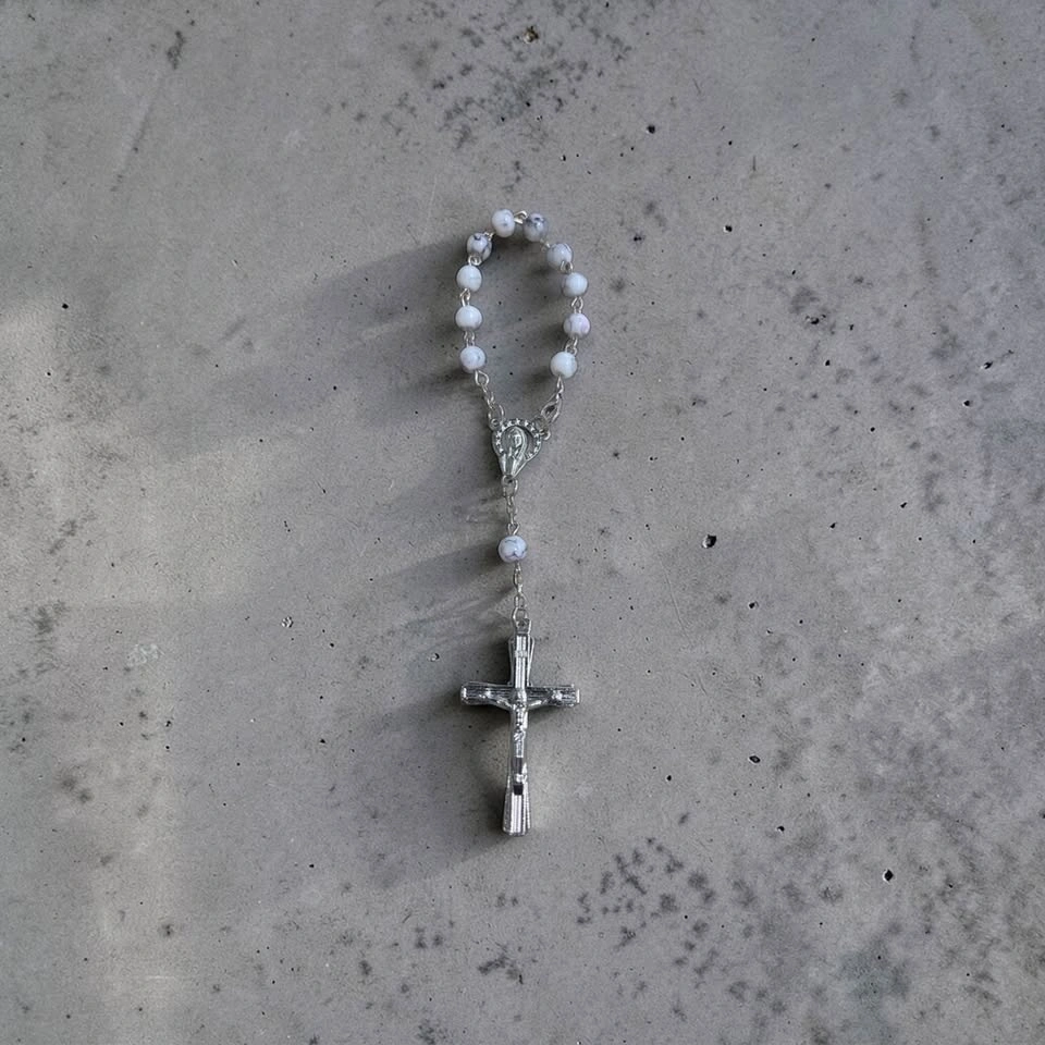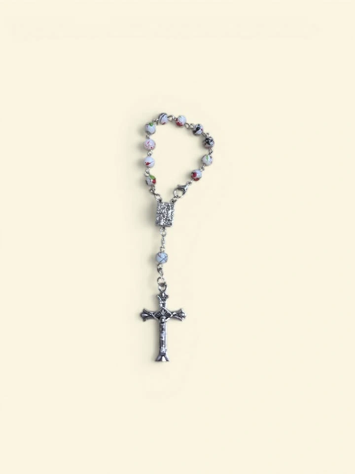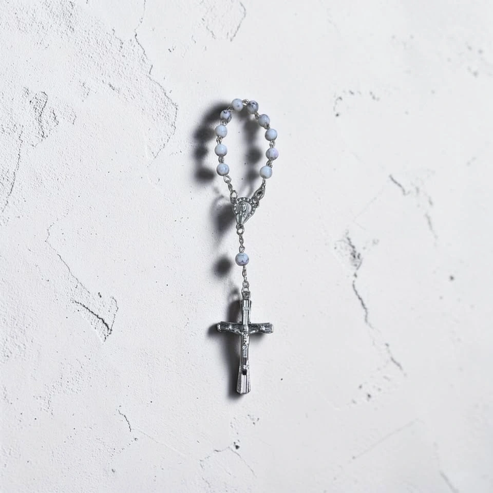 Soft, simple, and full of quiet reverence—this mini rosary brings a gentle, vintage light to every moment of prayer.