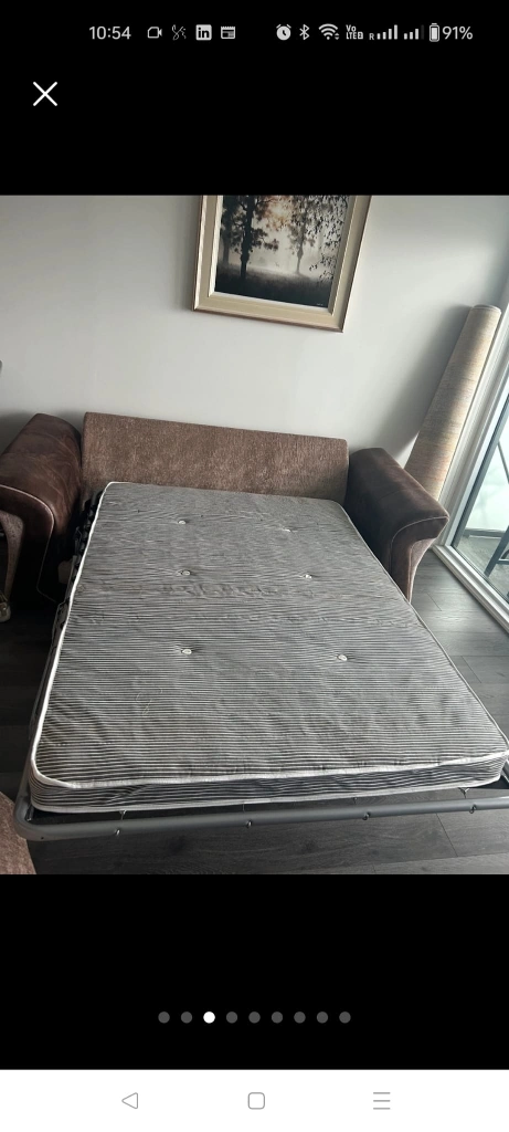 A sofa bed that converts into a double bed. Comes with a matching ottoman for extra storage. Upholstered in a blend of brown and textured fabric.