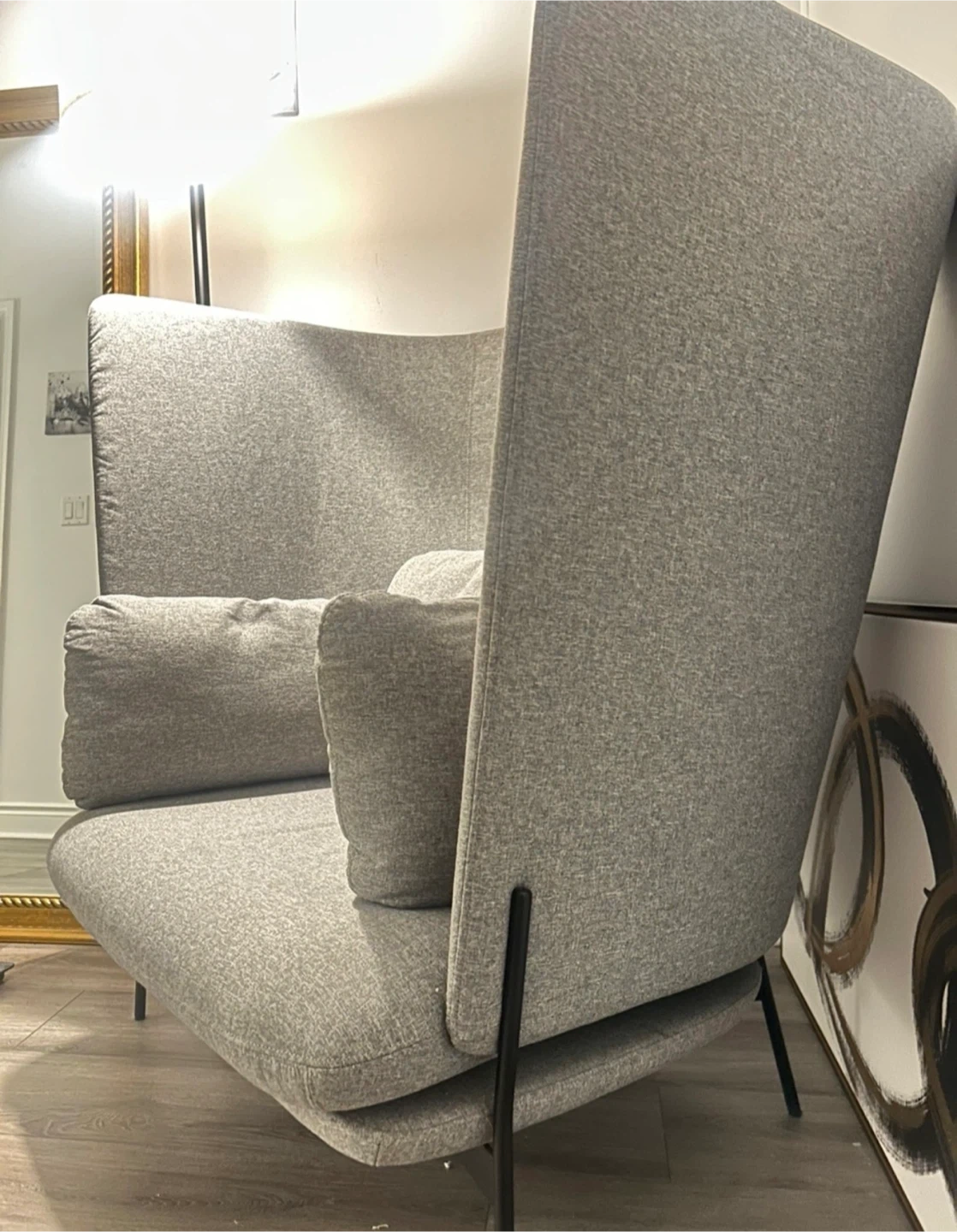Selling a comfortable Article Embrace armchair in a neutral grey colour. It's in great condition and would be a lovely addition to any living space. It features a high back and supportive armrests, perfect for relaxing with a good book or watching a movie. The chair is made with quality materials and has a modern design.
