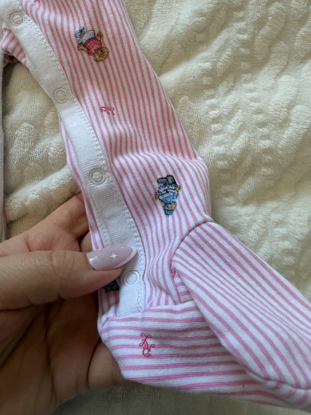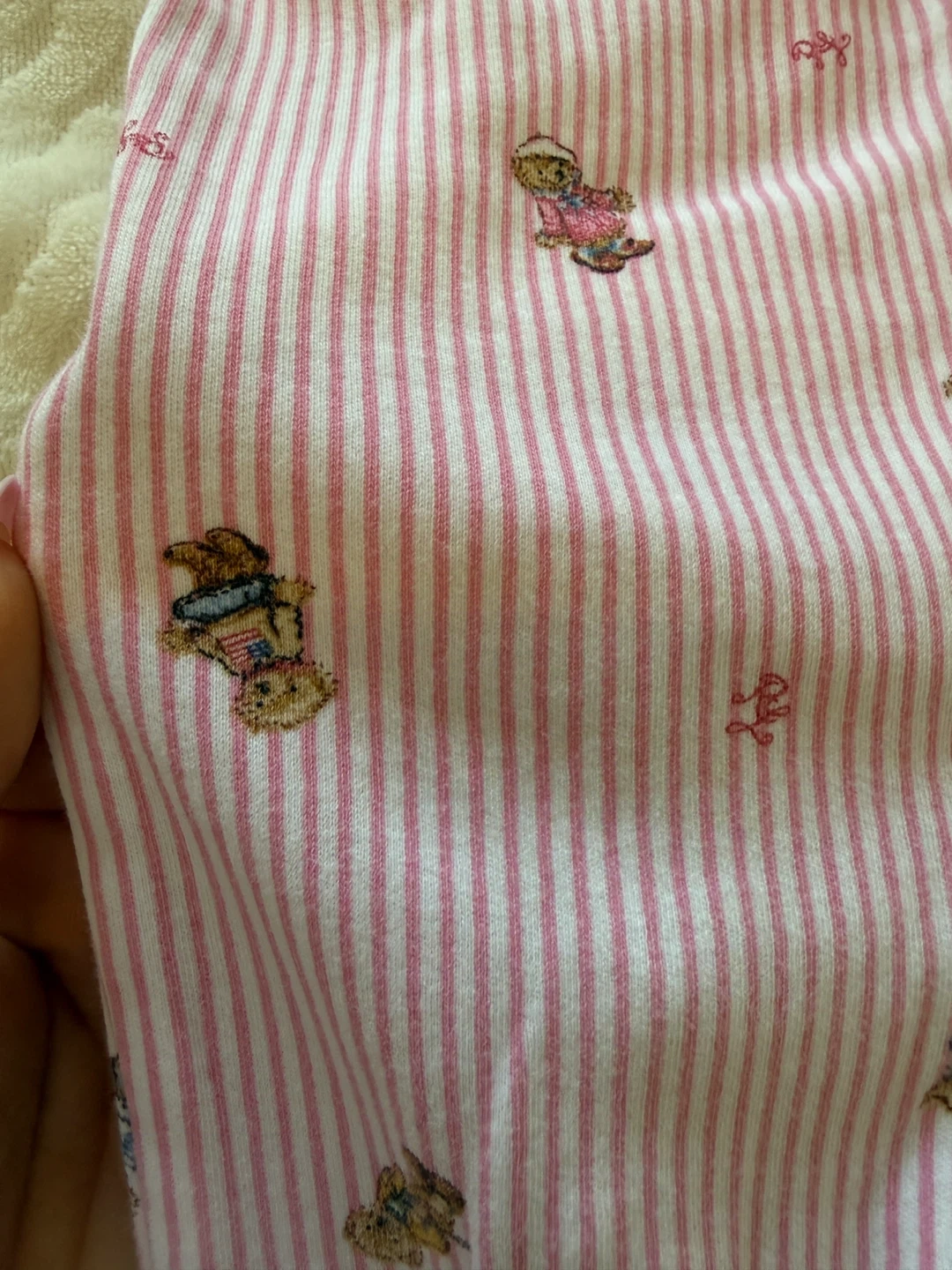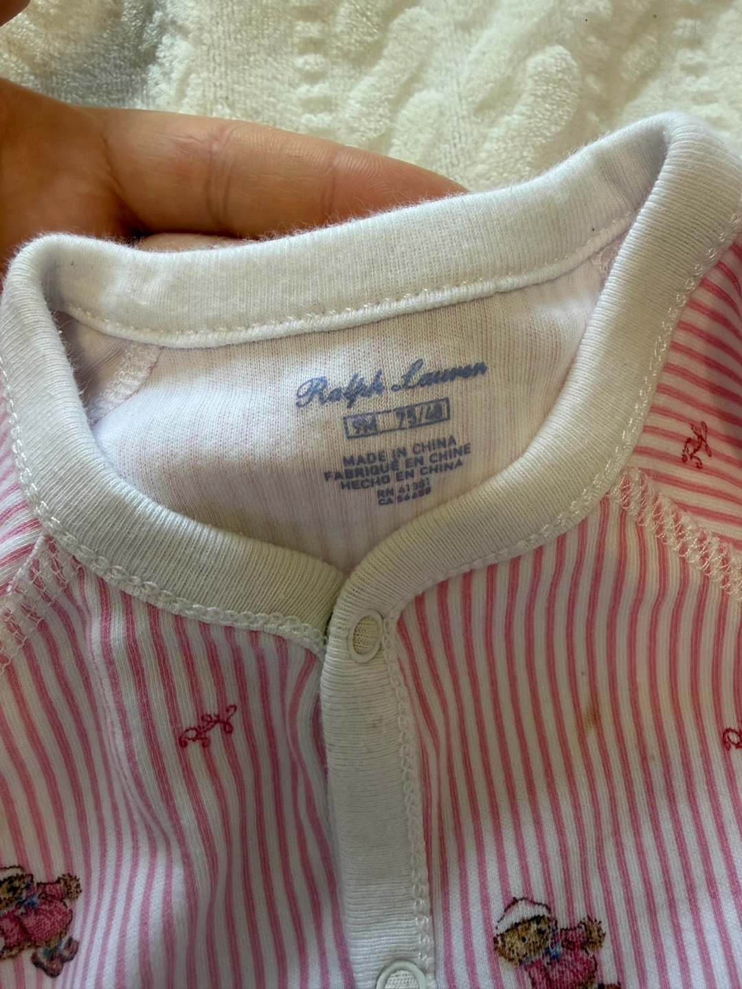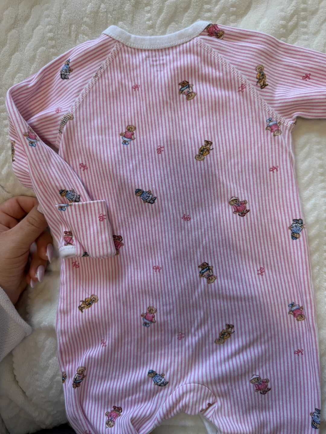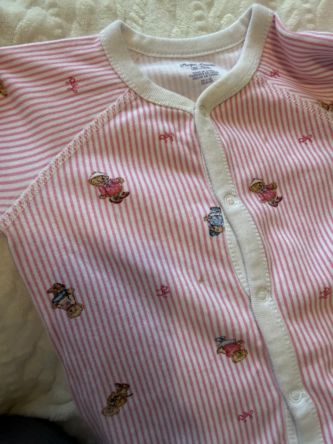A cute Ralph Lauren baby onesie in size 9M. It features a pink and white striped pattern with adorable teddy bear designs. There are some signs of wear, but it's still in good condition for your little one