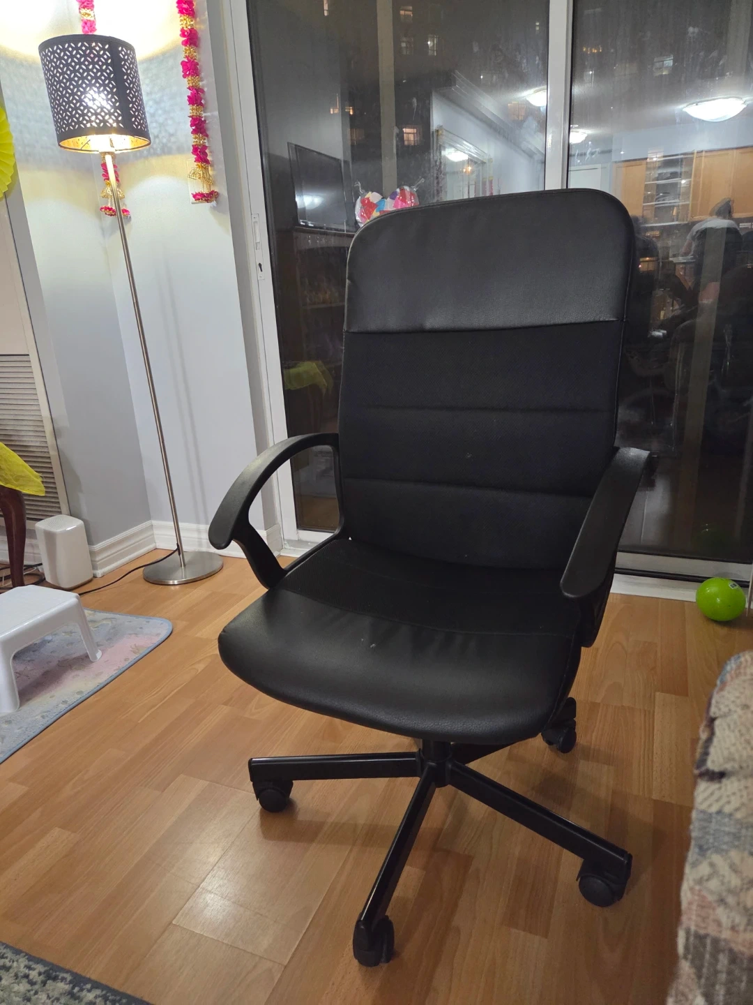 This is a black office chair with armrests and a wheeled base. It's upholstered in faux leather and features a padded seat and back. The chair's height is adjustable for comfort.
