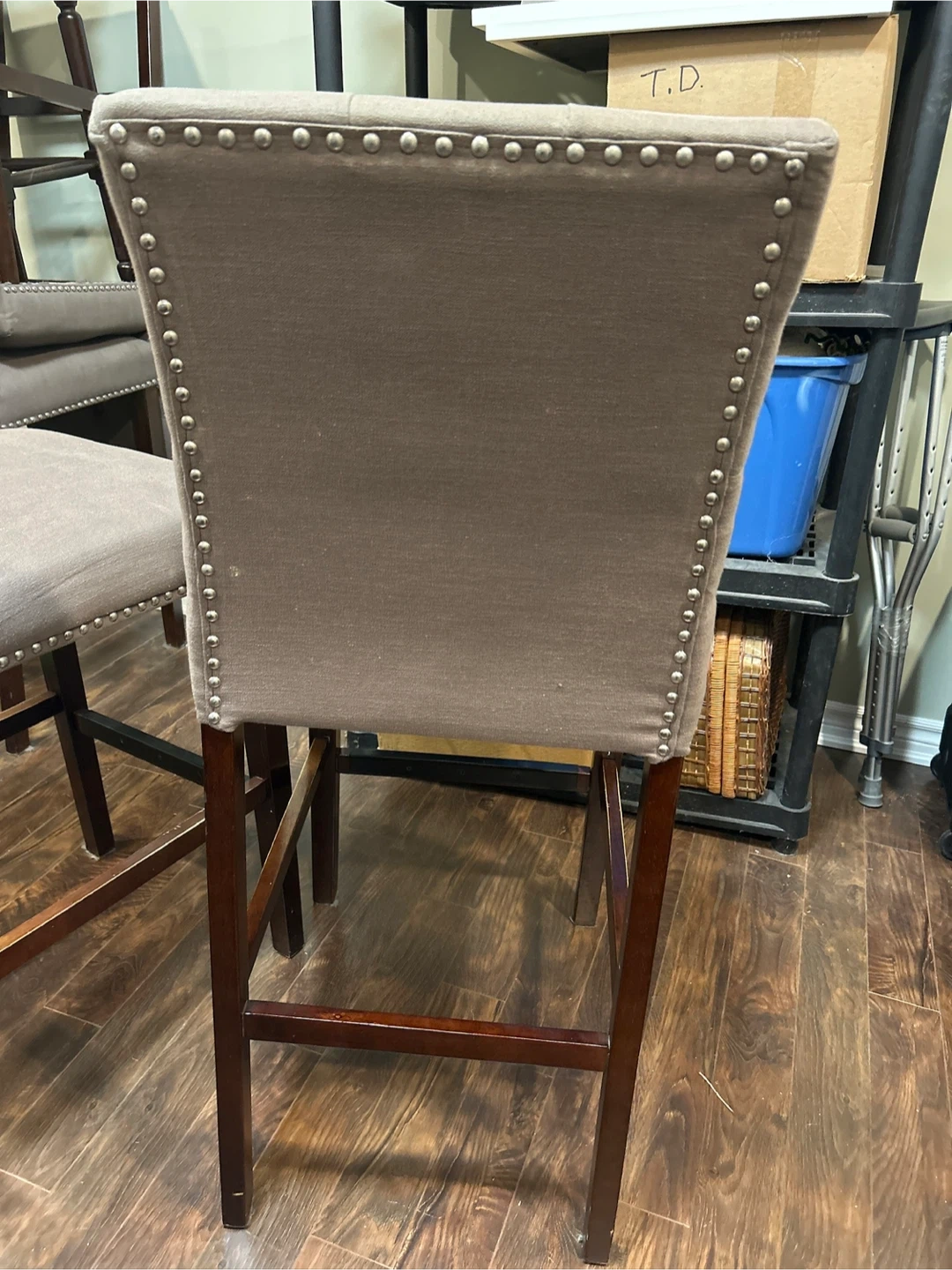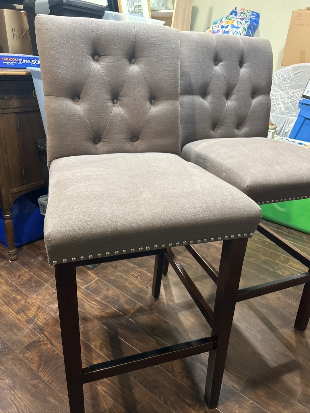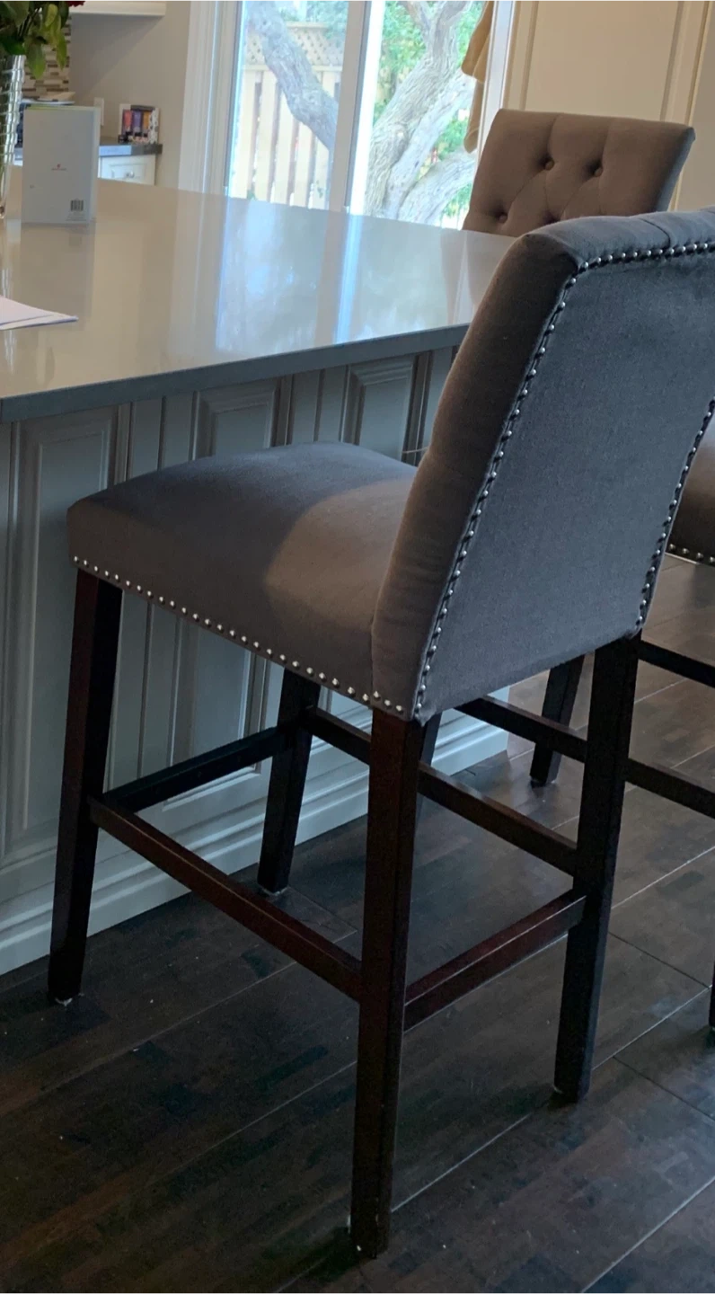4 Island seats , tufted back design with nailhead trim and a dark wood frame. Quality, comfortable and stylish seating for your kitchen island or bar area! Seats may need a quick steam clean from storage otherwise in great shape . Priced to sell $135 each