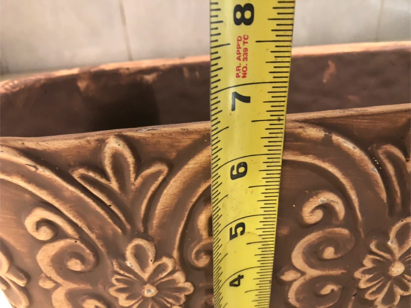 Decorative ceramic planter pot with embossed floral detailing. Made of ceramic material. Measurements in pictures