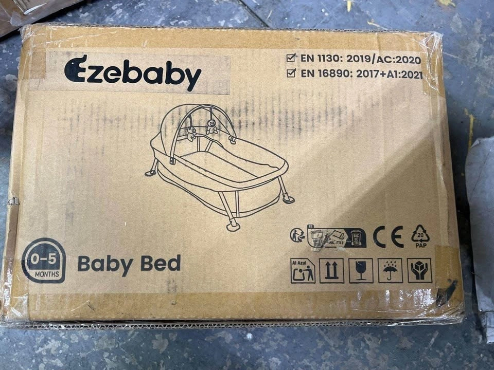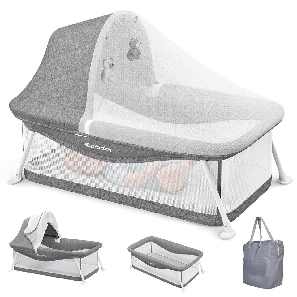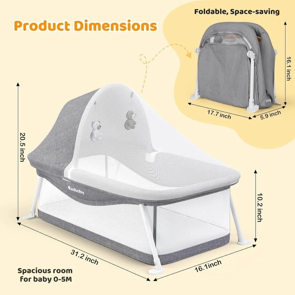 New Ezebaby BN002 portable baby bassinet in gray. Includes a canopy, mosquito net, and hanging bear toys. It folds up and comes with a carry bag for travel or storage. Suitable for babies aged 0-5 months. Dimensions when set up are approximately 31.2" L x 16.1" W x 20.5" H. Folds down to 17.7" L x 5.9" W x 16.1" H.