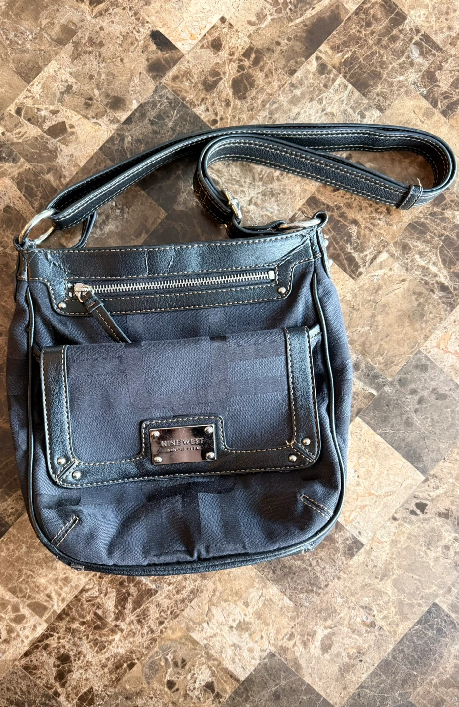 A classic black Nine West crossbody purse. It's made from durable fabric with faux leather trim. Multiple pockets inside and out offer great organization. This purse is perfect for everyday use!