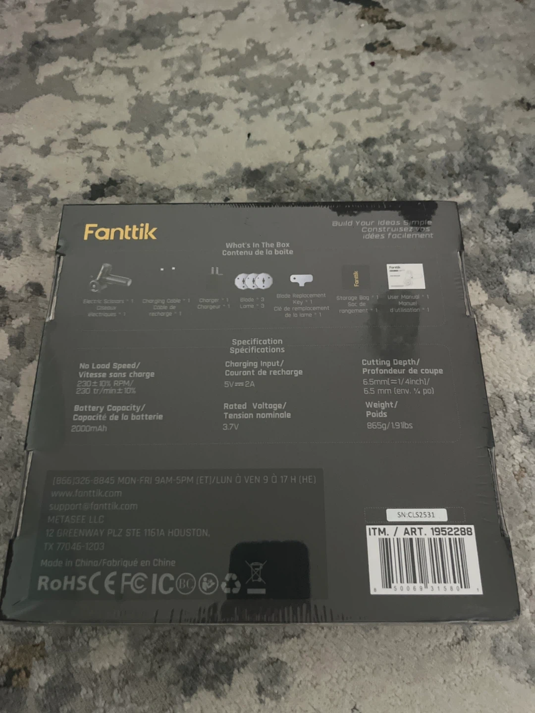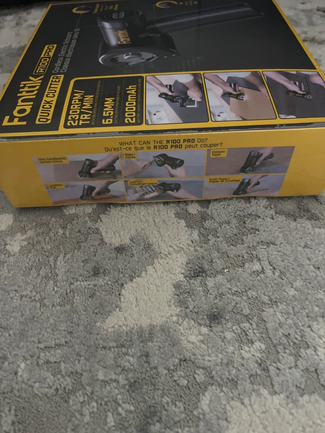 Fanttik R100 PRO cordless electric scissors with a 2000mAh battery. Cutting depth of 6.5mm (1/4 inch). Includes two blades and a charging cable.