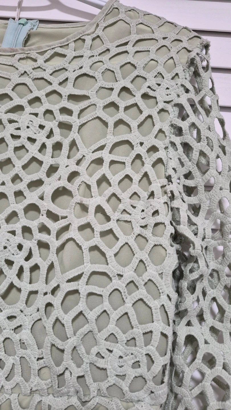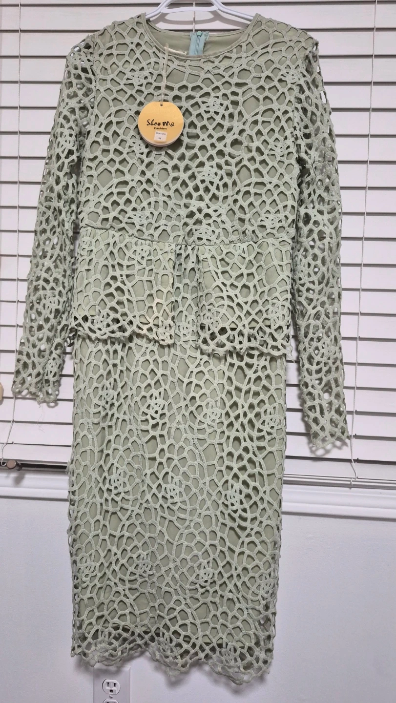 This is a women's dress from Show me Fashion. It's a size 38 with a unique all-over cutout design. Perfect for a special occasion or elegant event!