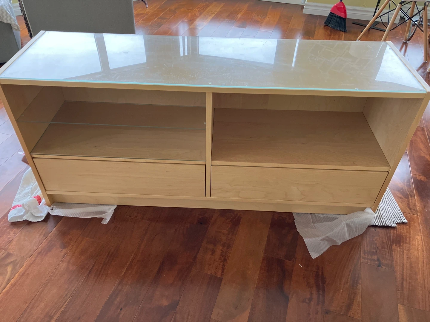Selling a light wood TV stand! It has two drawers and glass shelves, great for storing media or displaying decor. It's in great condition and ready for a new home entertainment setup.