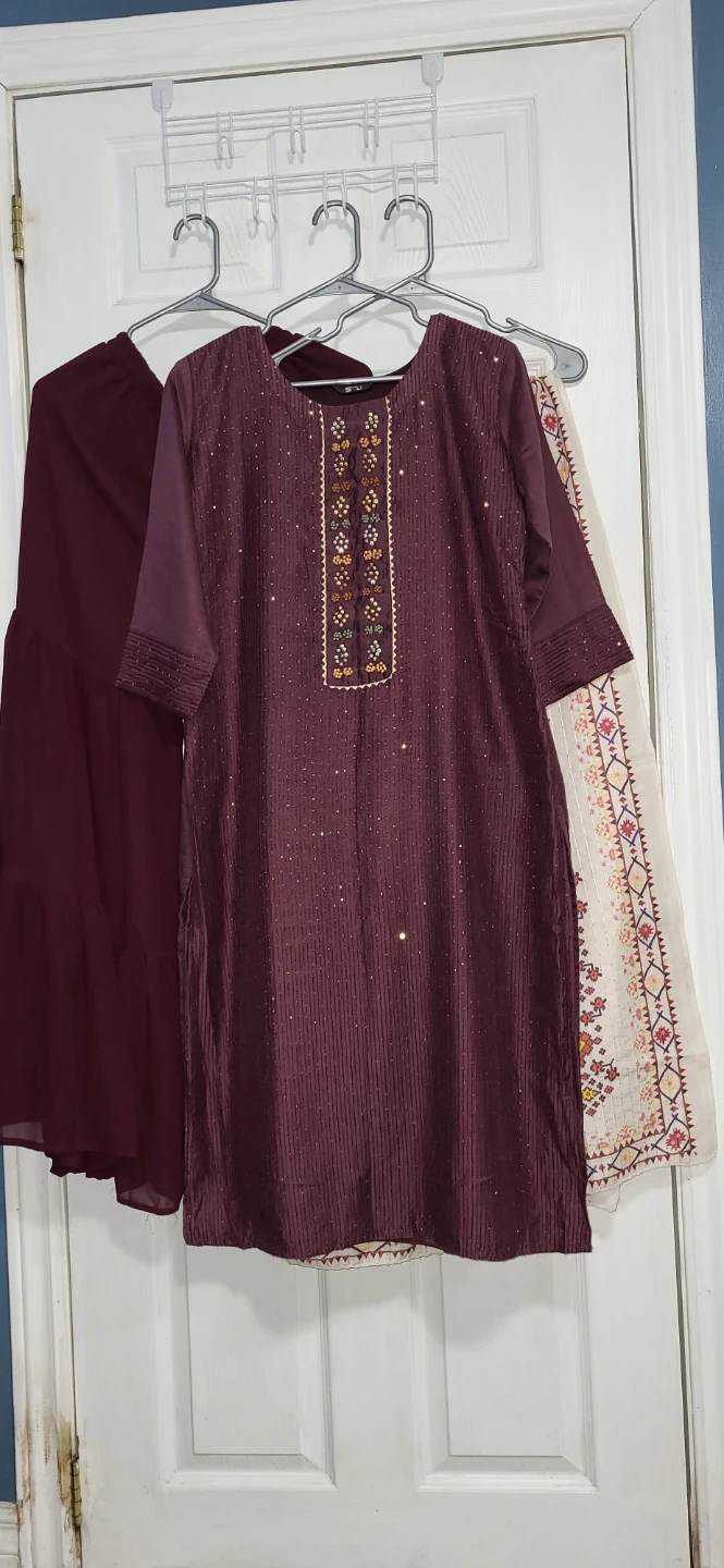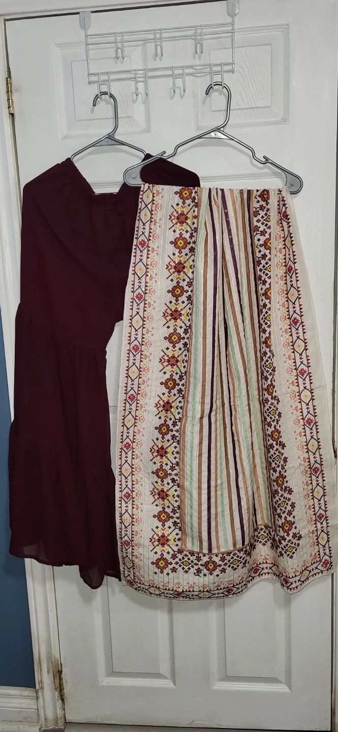 Selling a beautiful Maroon/Brown dress with intricate embroidery and Sharara. It's a size XL and comes with a matching dupatta. The beauty of dupatta is eye catching, you will steal the all attentions around you. Perfect for a special occasion!(Worn Only Twice)