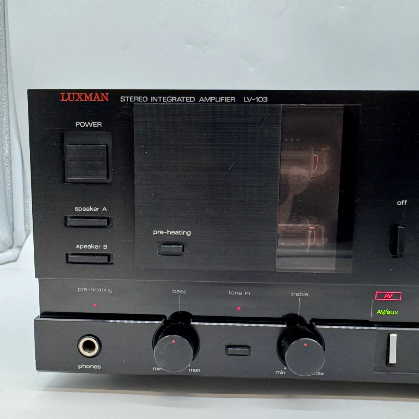 This is a vintage Luxman LV-103 stereo integrated amplifier from the late 1980s. This model is a hybrid tube amplifier, combining vacuum tube warmth with solid-state performance, making it highly desirable among audiophiles.
