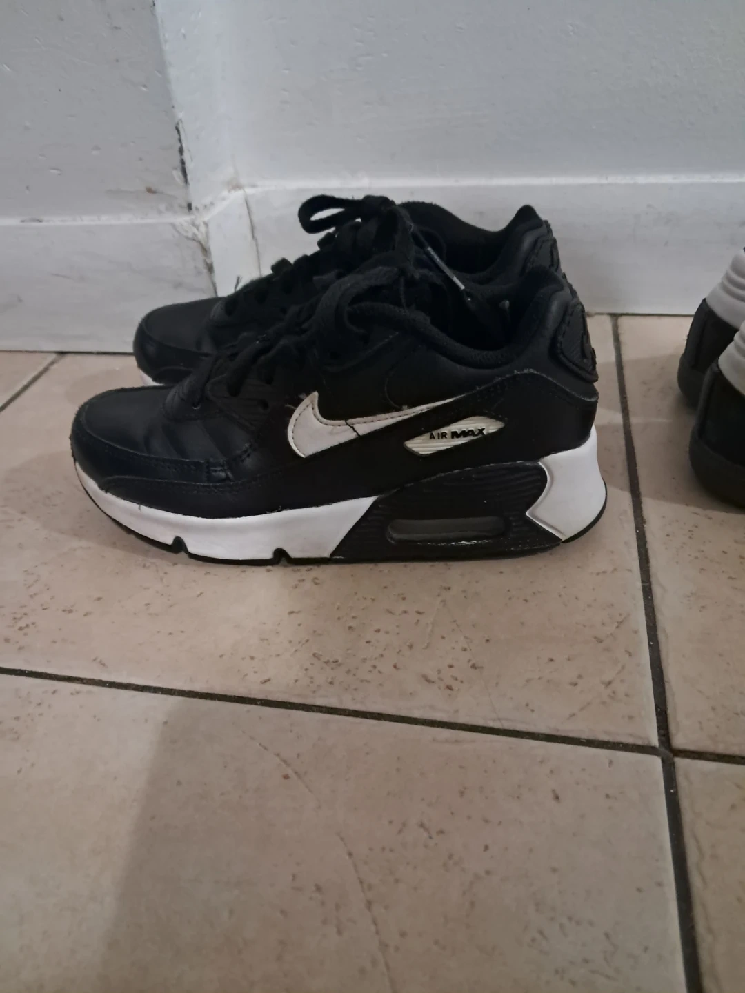 Classic black and white Nike Air Max 90 sneakers. Leather and synthetic upper with rubber sole. Lace-up closure for a secure fit.
