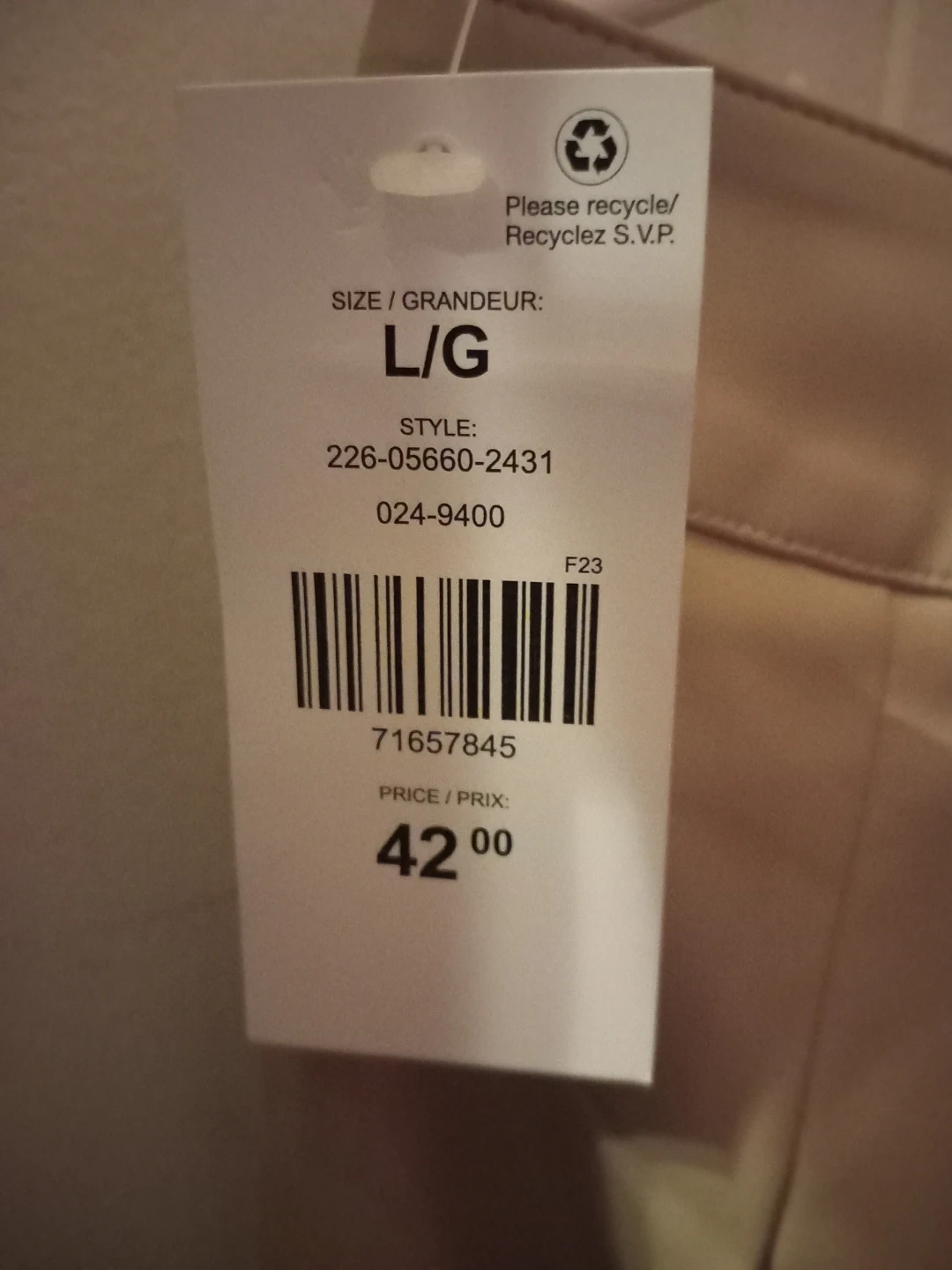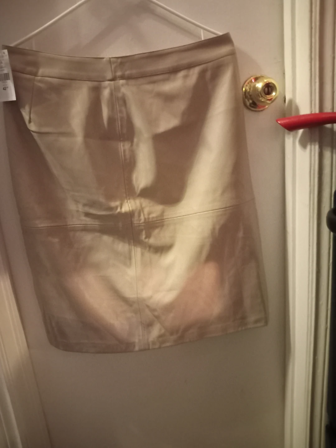 This is a faux leather pencil skirt. It's a size L/G. The colour is beige and has a blue stain from being stored away as seen brand new asking $5