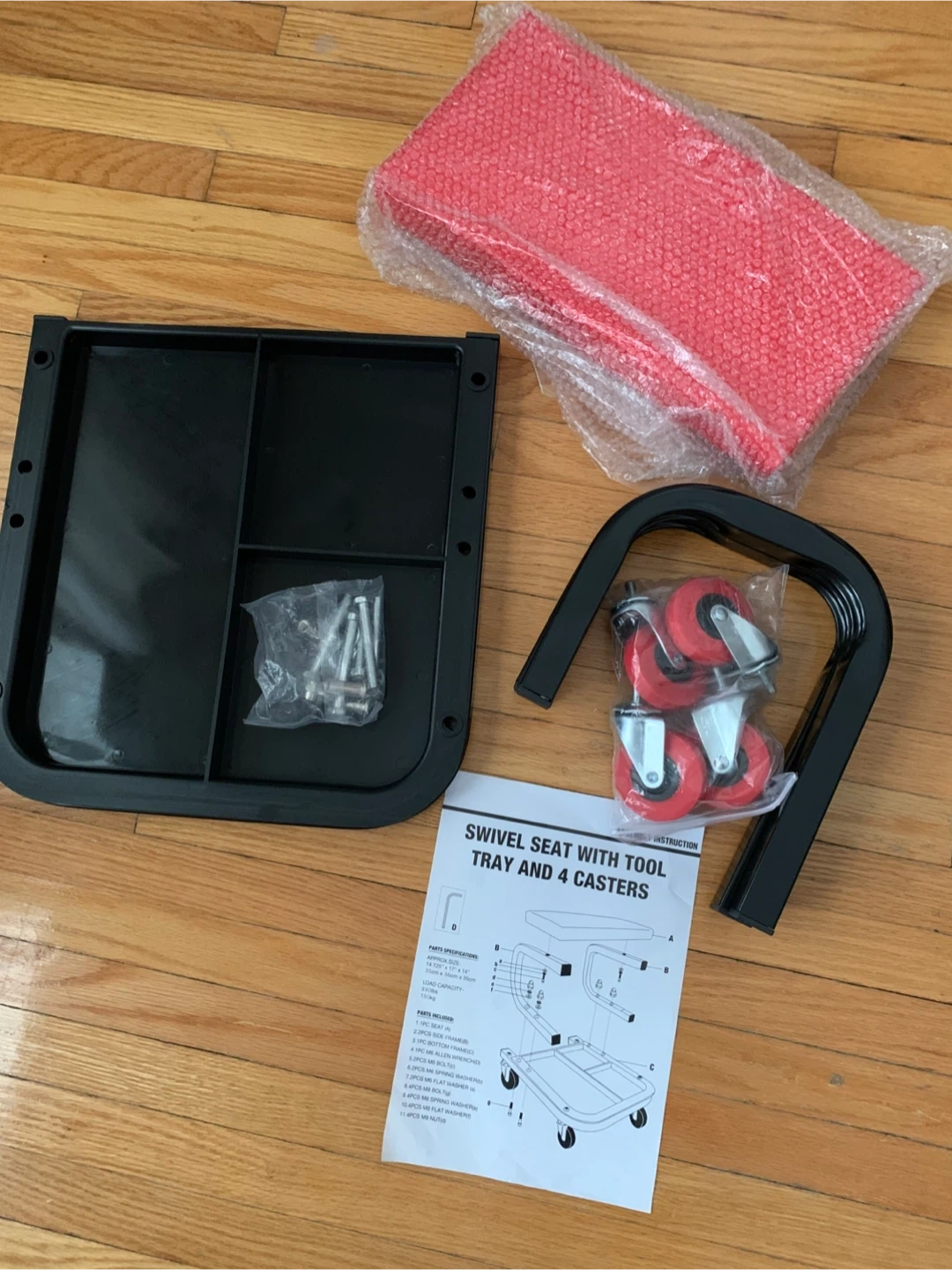 This swivel seat includes a handy tool tray and four smooth-rolling casters for easy movement. It has a load capacity of 330lbs. The approximate seat size is 14" x 12" x 14" (35cm x 30cm x 35cm).