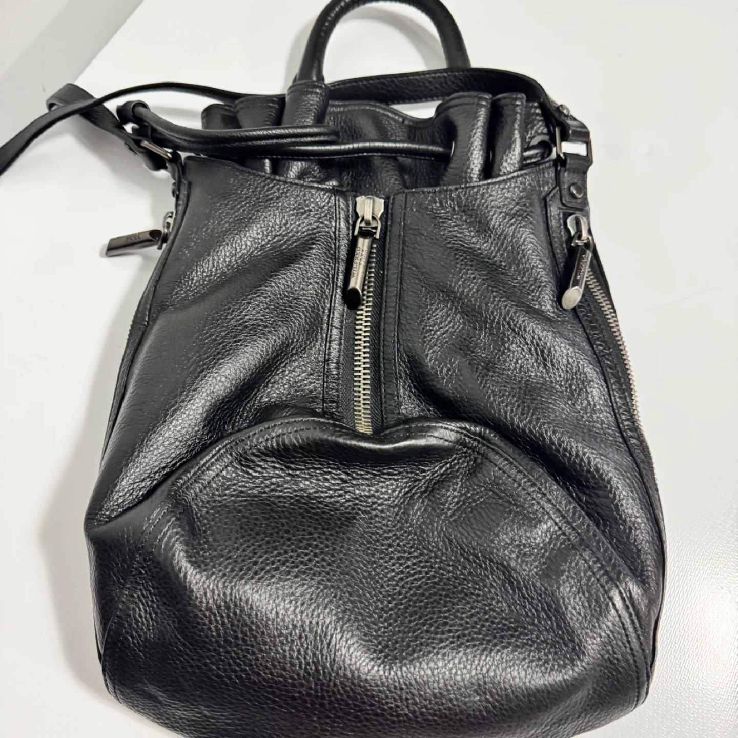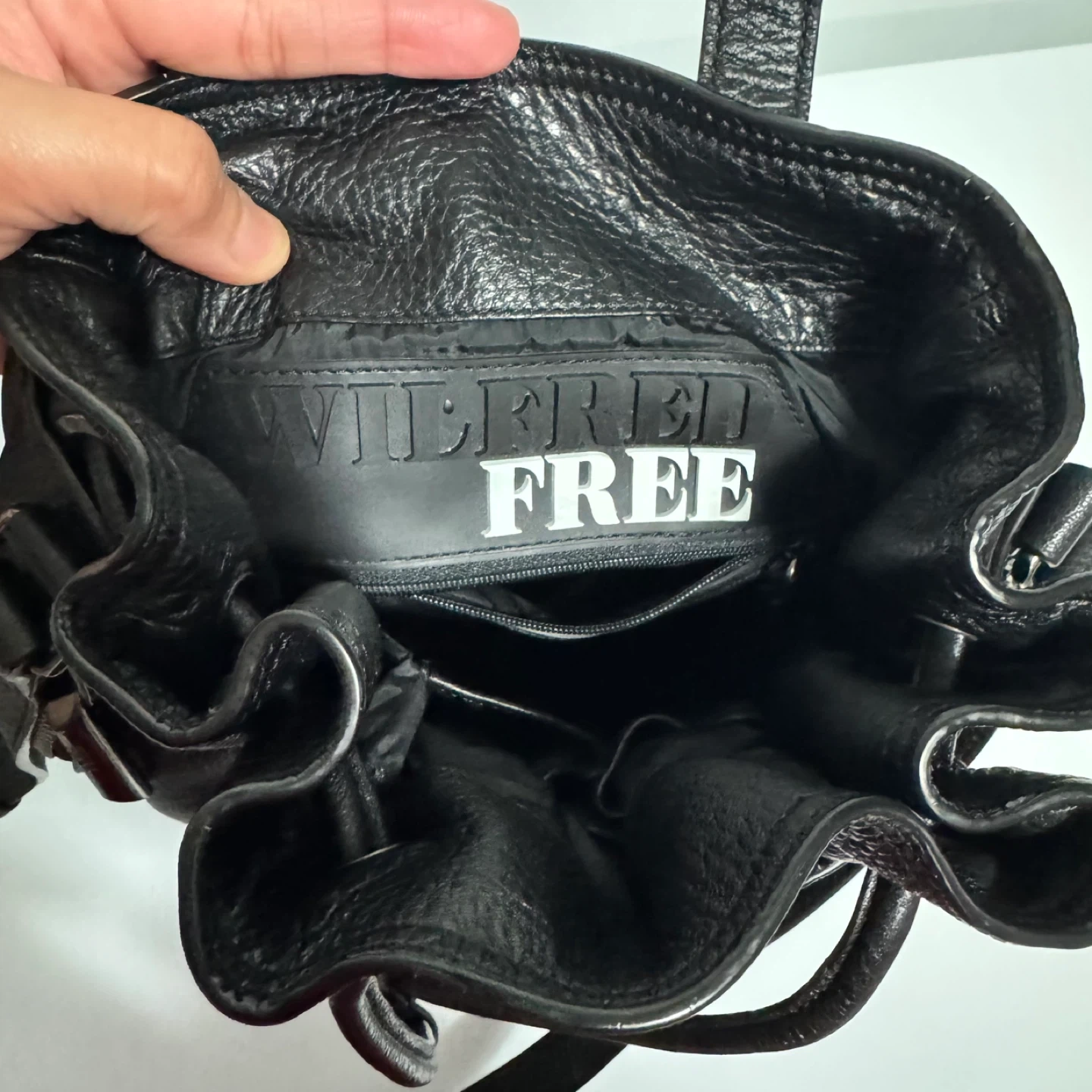 This is a Wilfred Free black leather bag. It features a drawstring closure and a zippered front pocket. The interior has a zippered compartment and is lined with fabric. Leather material.
