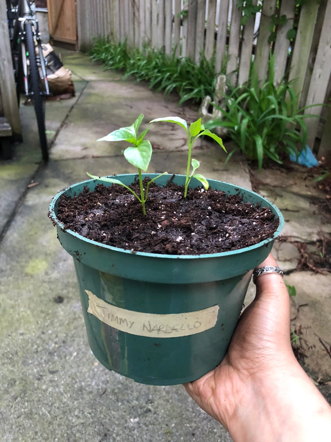 Two jimmy nardello sweet pepper seedlings in a turquoise plastic pot with drainage and slightly fertilized soil. Swipe for photos of what they will look like! Grown from seeds. They will need to be put into separate pots once they get bigger. The peppers are delicious and taste like a sweet bell pepper. Can be put outdoors once it gets warmer out.