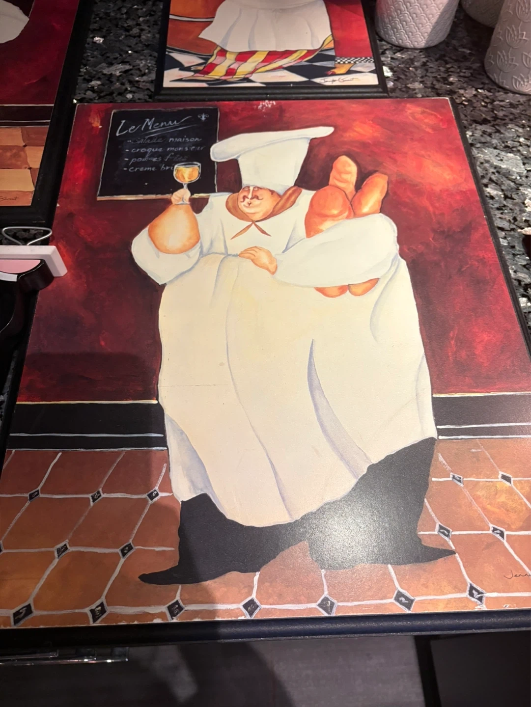 Set of four charming art prints featuring chefs. Each print showcases a unique culinary scene with vibrant colours and a playful design. These decorative pieces add a touch of whimsy to any kitchen or dining area. A delightful addition for anyone who loves cooking or fine dining! Chef Large H-20.75” by W-16.5” Chef Small H-14” by W-10” Clock H-9.75” by W-9.5”