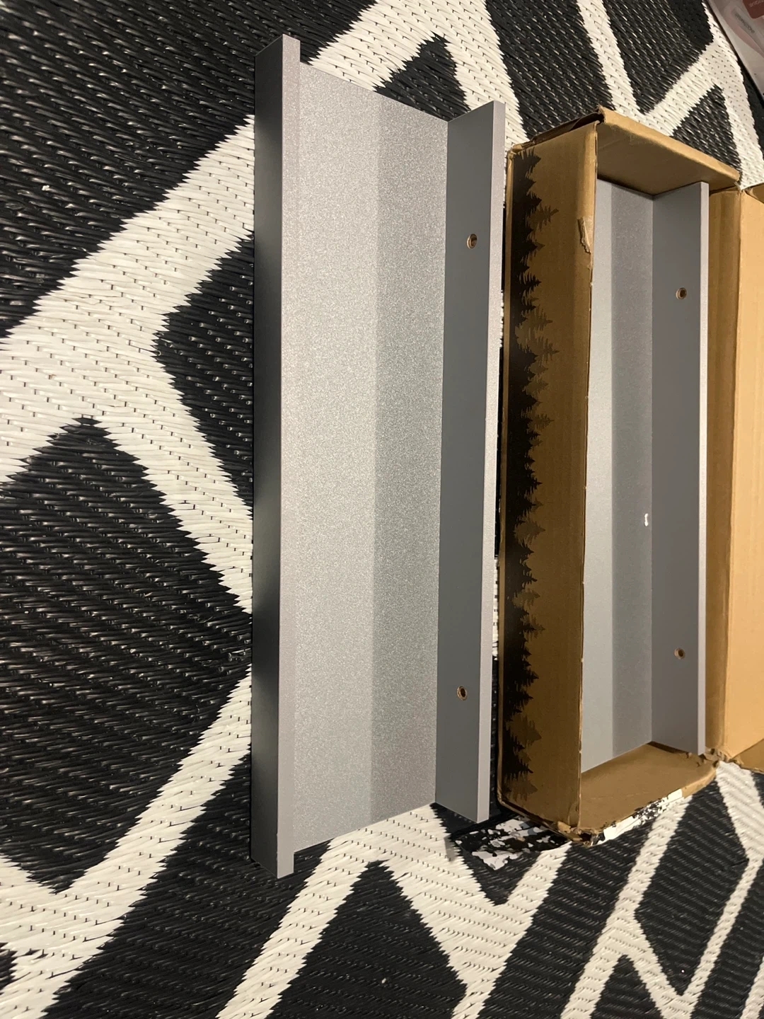 It's a grey metal floating shelf. The shelf is 24 inches long and made of wood . It includes mounting hardware. This shelf is suitable for displaying small items.