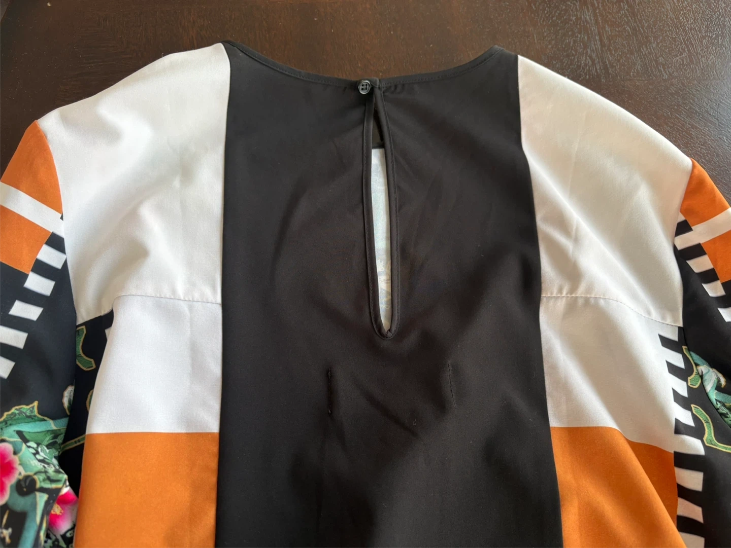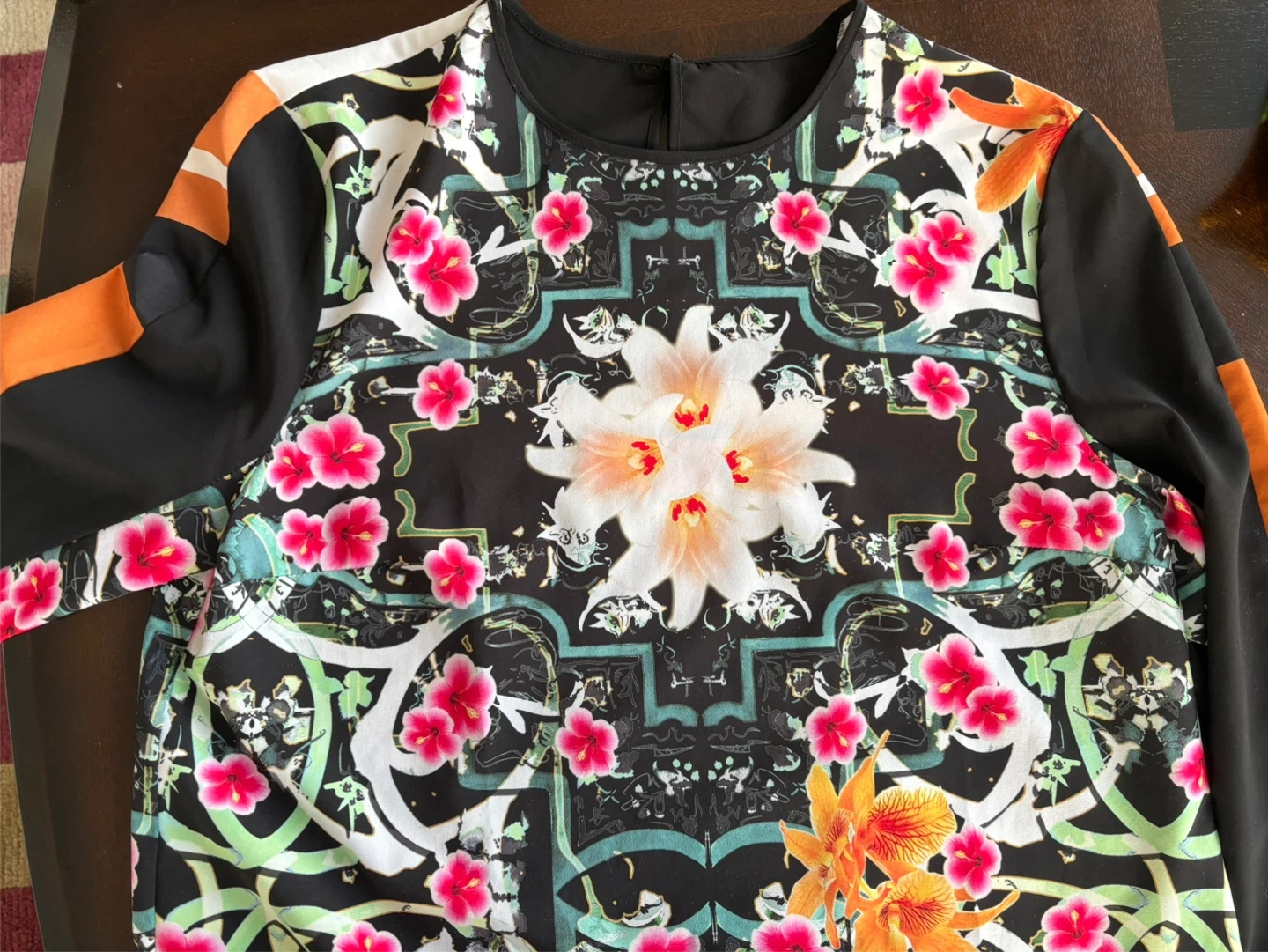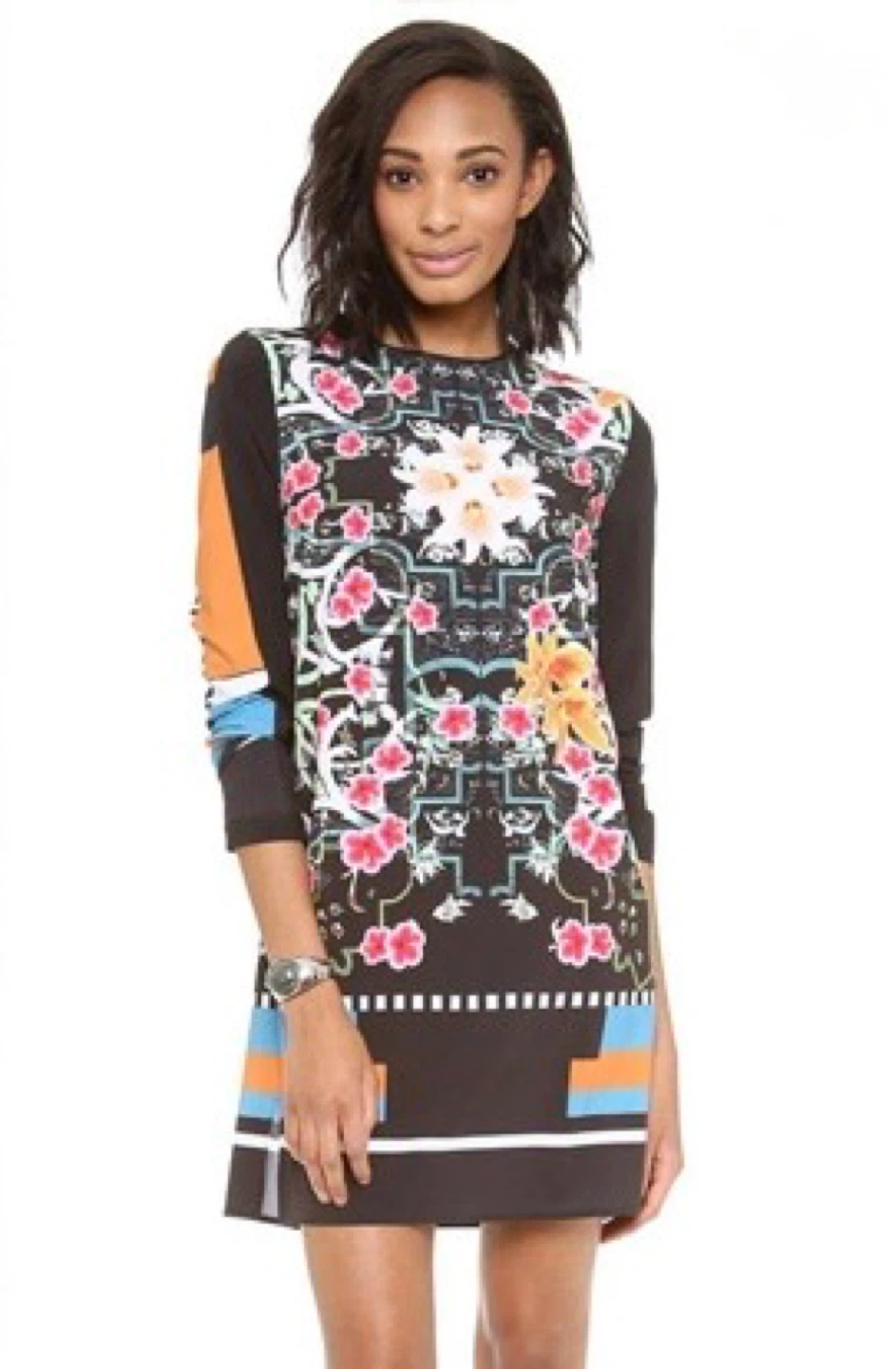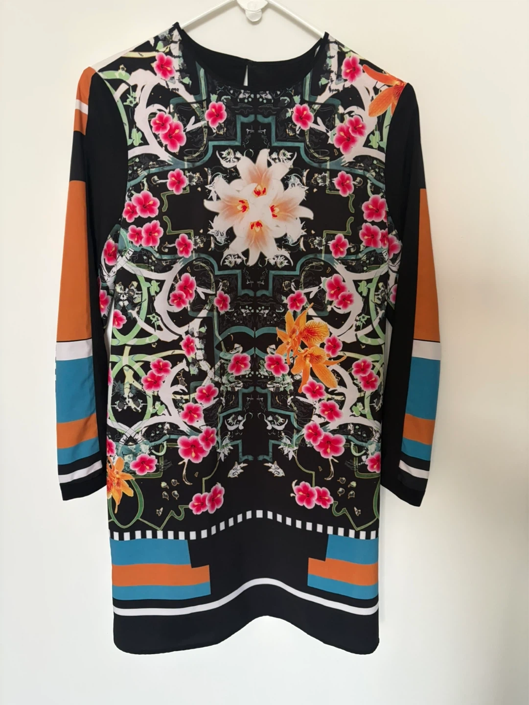 Elegant black mini dress with vibrant floral patterns. Long sleeves, classic shift silhouette. Really cool print which is the brand’s signature style. Perfect condition.