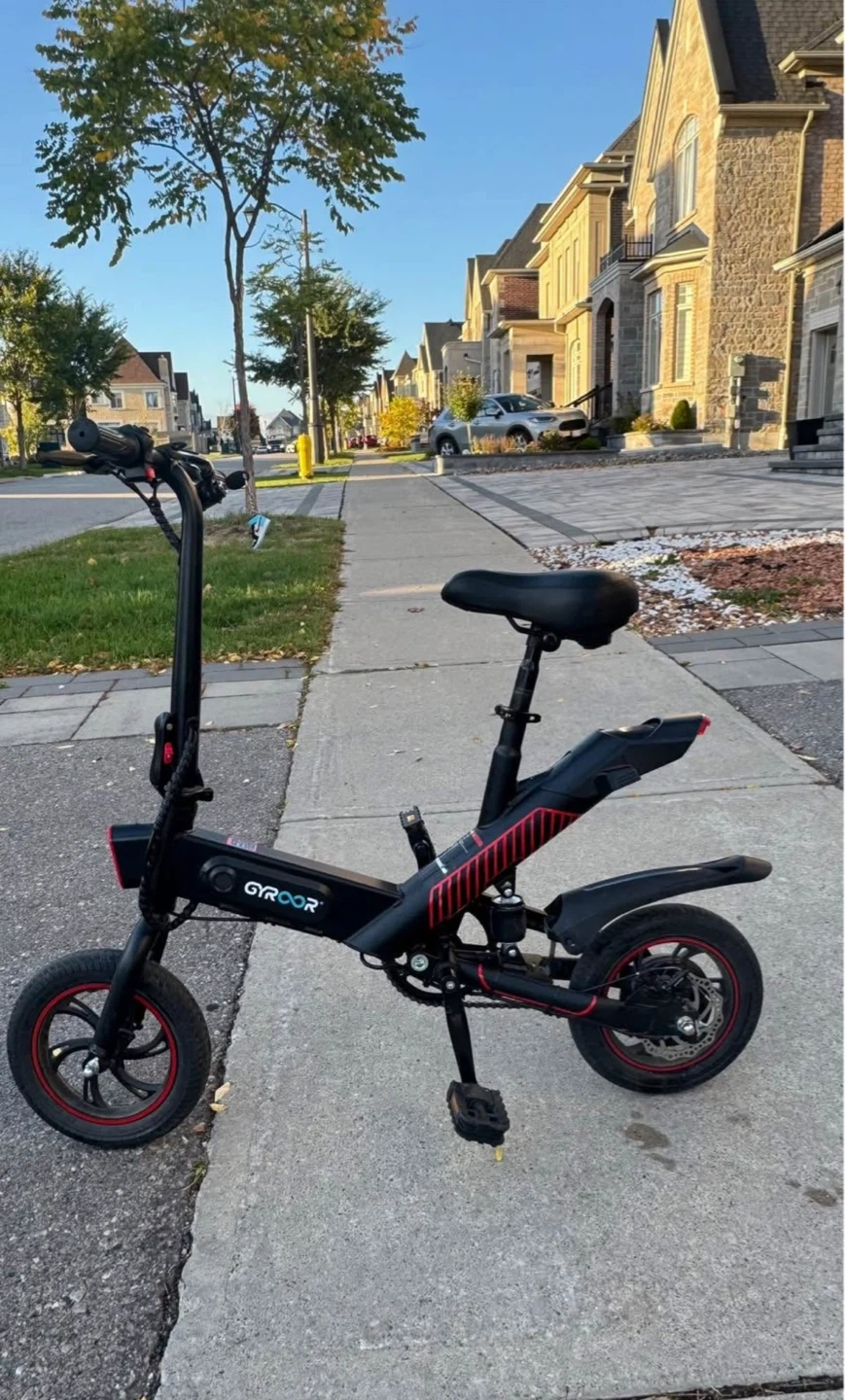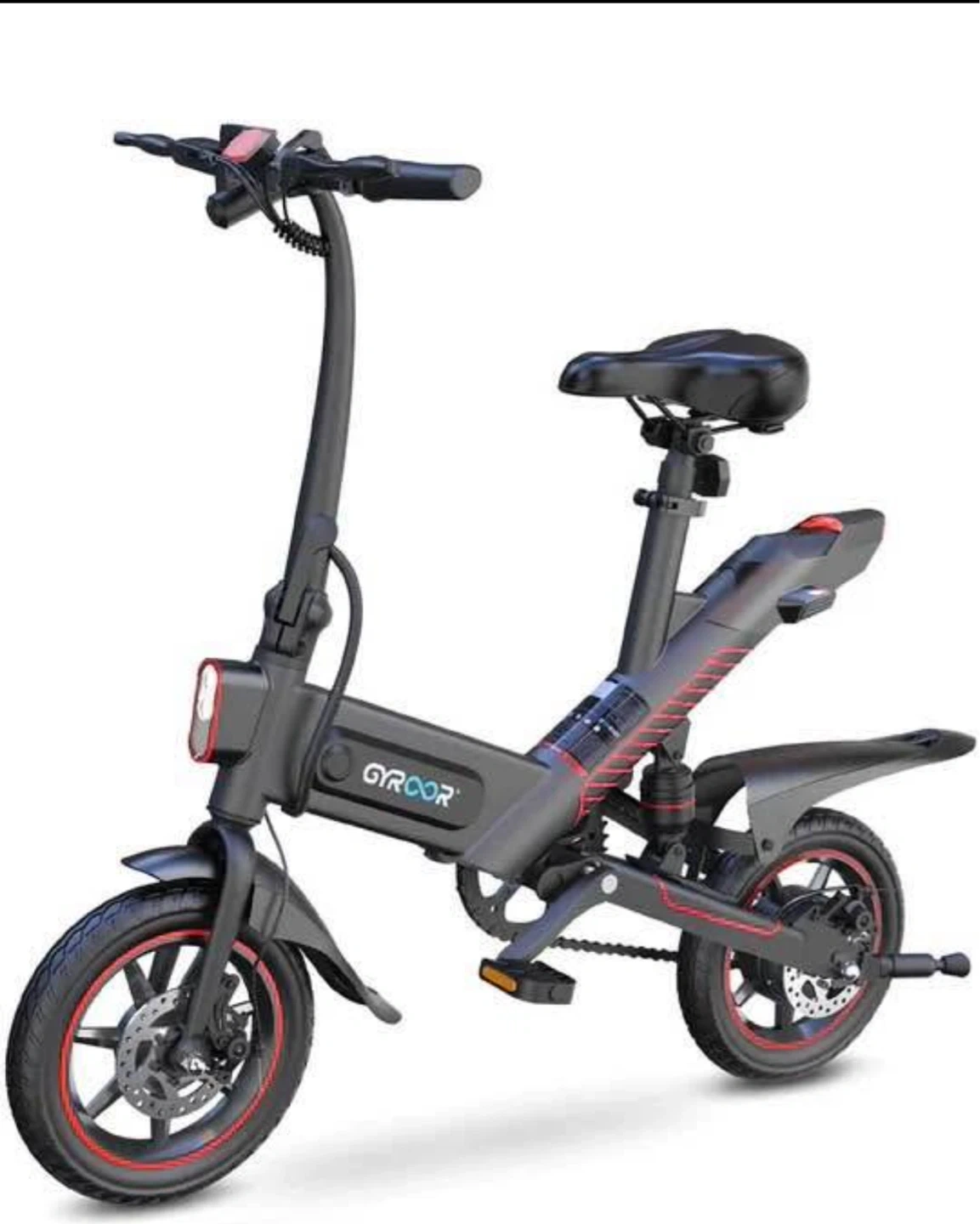 This is a black electric bike from GYROOR. It's designed for convenient personal transportation. The e-bike is foldable, making it easy to store and transport. Good for ages 9-14