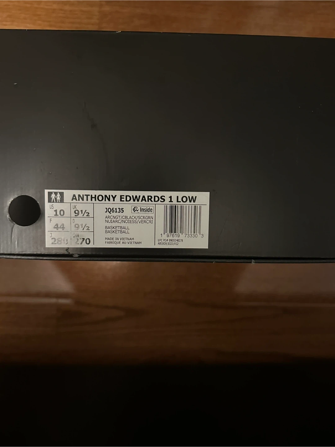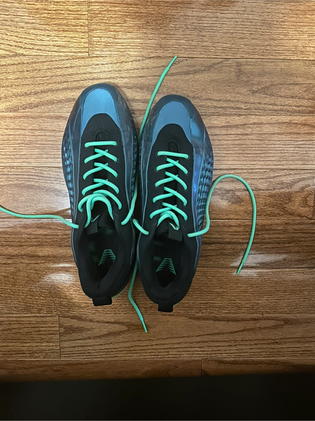 These are Anthony Edwards basketball shoes with a black and green colour way. They come with mint green laces and include the original box.