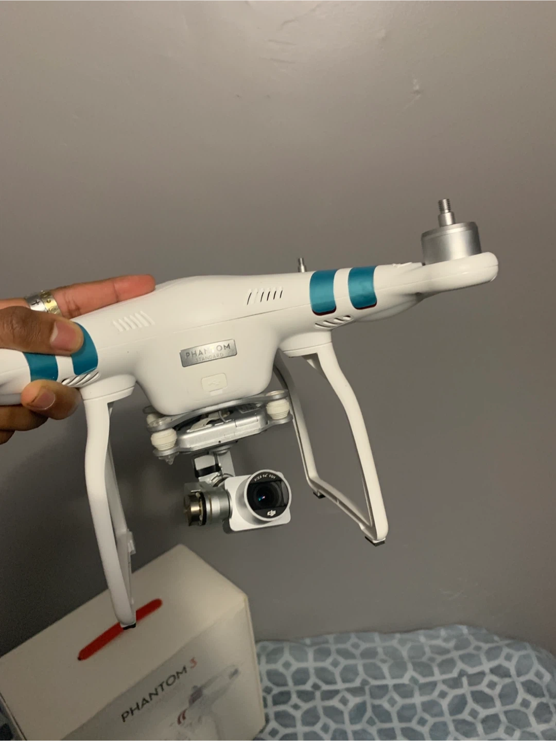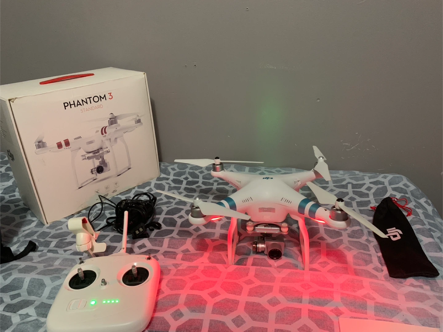 This is a DJI Phantom 3 Standard drone. It comes with a controller, extra propellers, and a battery. The original box is also included.