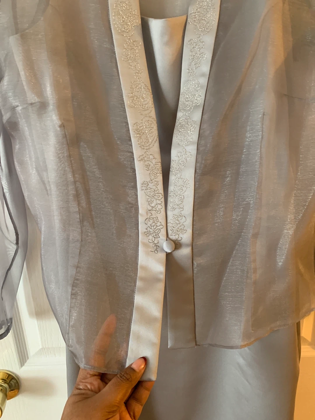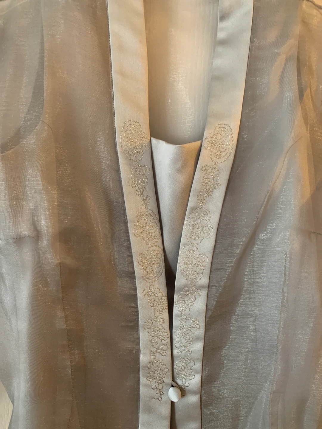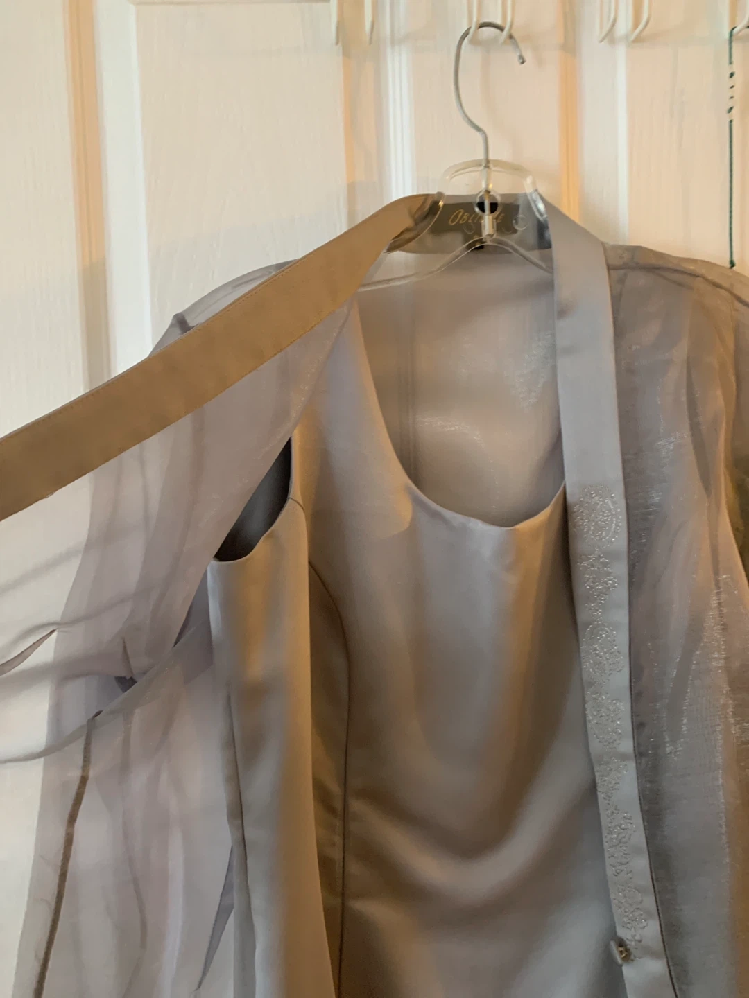 This OBLIQUE matching set features a grey sheer organza jacket with embroidered trim and a sleeveless satin dress. The jacket has a single button closure. Dress is size 8./m