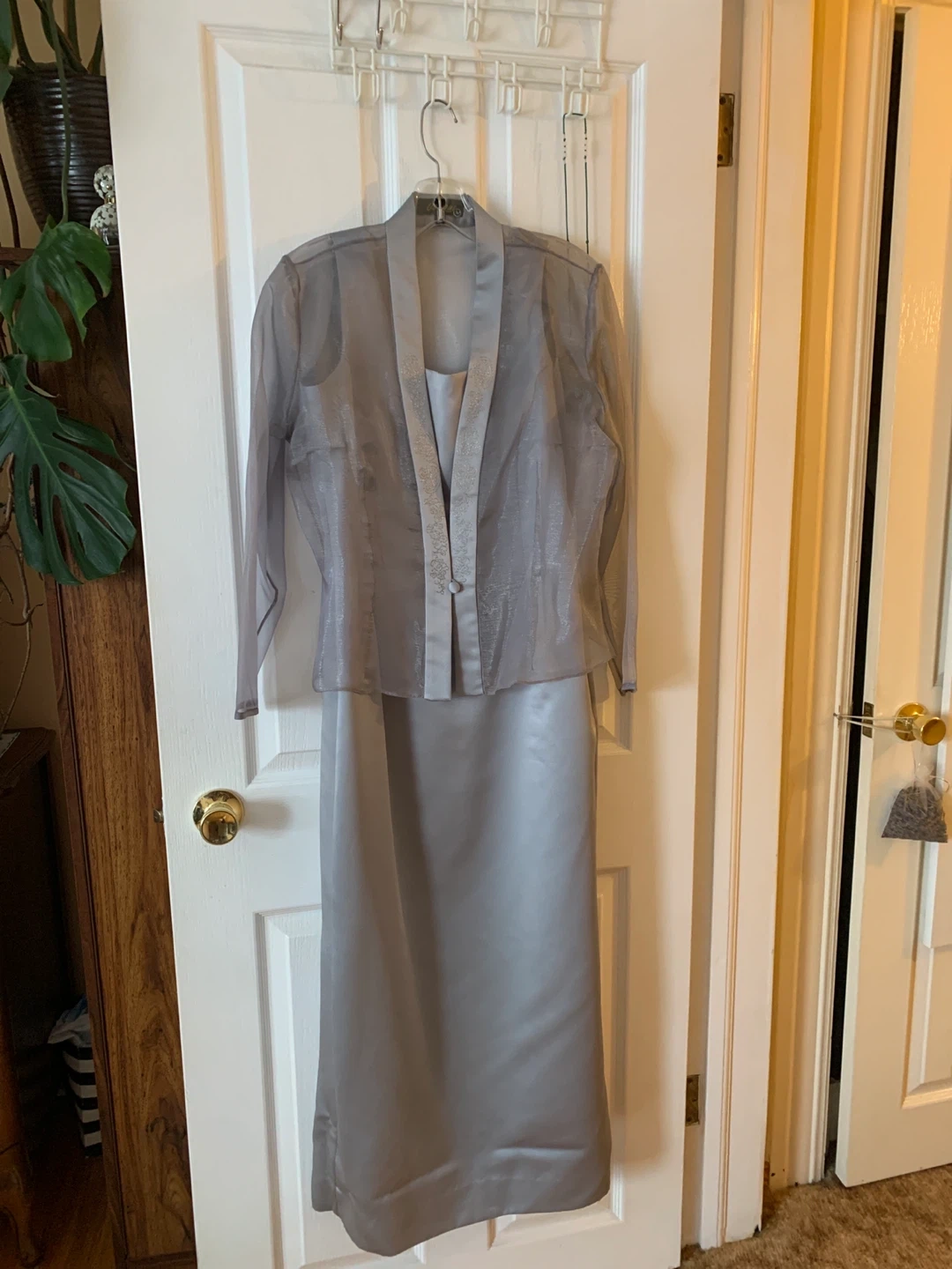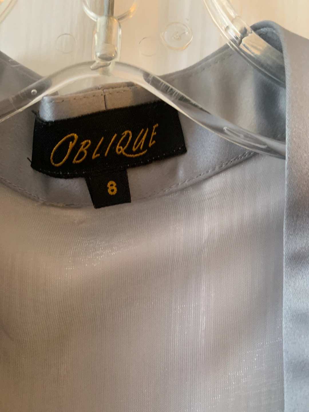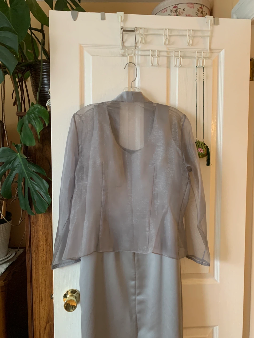 This OBLIQUE matching set features a grey sheer organza jacket with embroidered trim and a sleeveless satin dress. The jacket has a single button closure. Dress is size 8./m