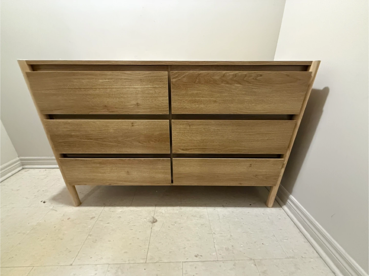 Six-drawer dresser with an oak finish. It has tapered legs and drawer fronts. Ample storage space for clothing or other items. Fits well in bedrooms or living spaces.
