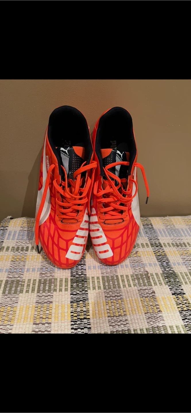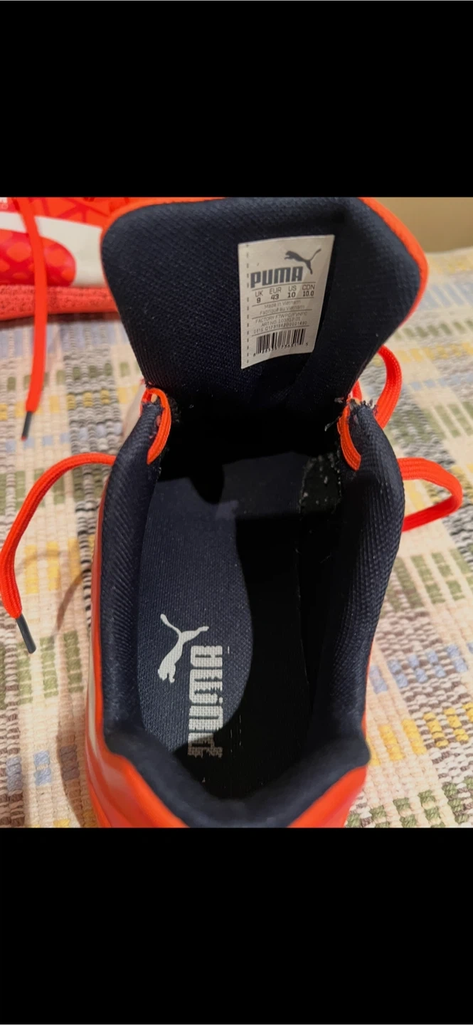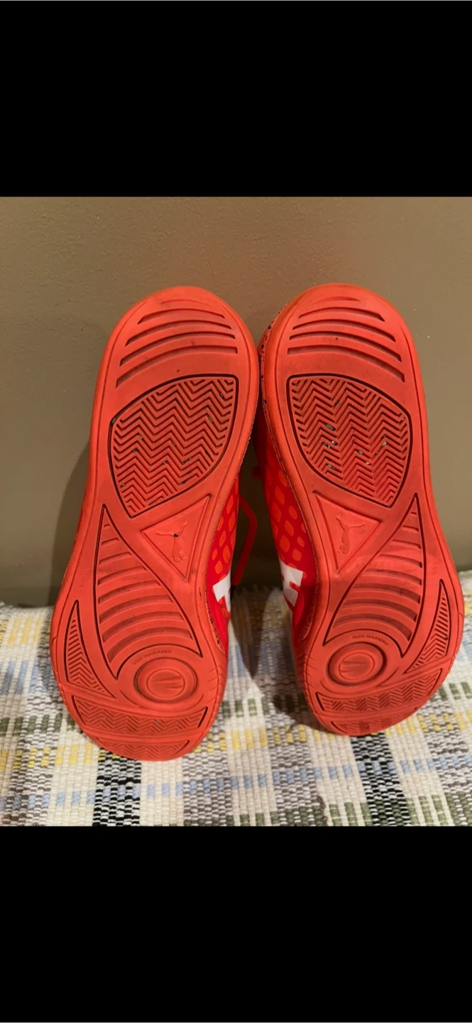 These Puma soccer shoes are bright orange with white accents. They're designed for indoor play. Size 10.5 US Men's.