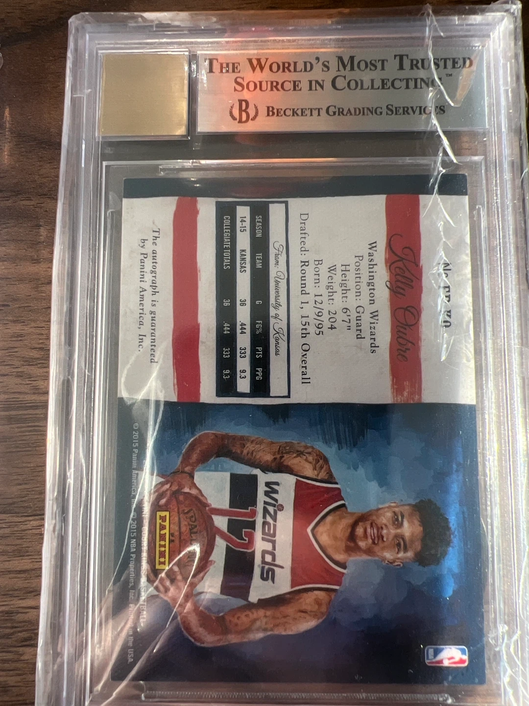 This is a 2015-16 Court Kings basketball card featuring Kelly Oubre Jr. of the Washington Wizards. It's an autographed "Fresh Paint" edition. The card is graded a 9 by Beckett Grading Services, with a perfect 10 for autograph! It's a great collectible for any basketball fan.