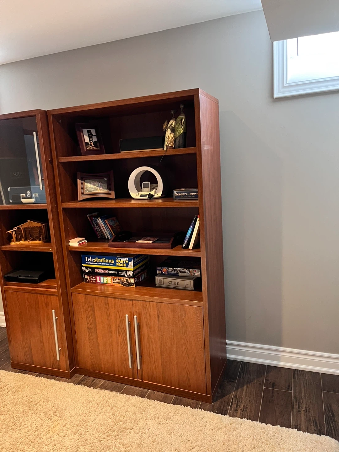 This entertainment unit is made of wood with a glass-fronted cabinet section and multiple shelves. It features lower cabinets for storage and a wide top surface. Great for organizing media and decor!