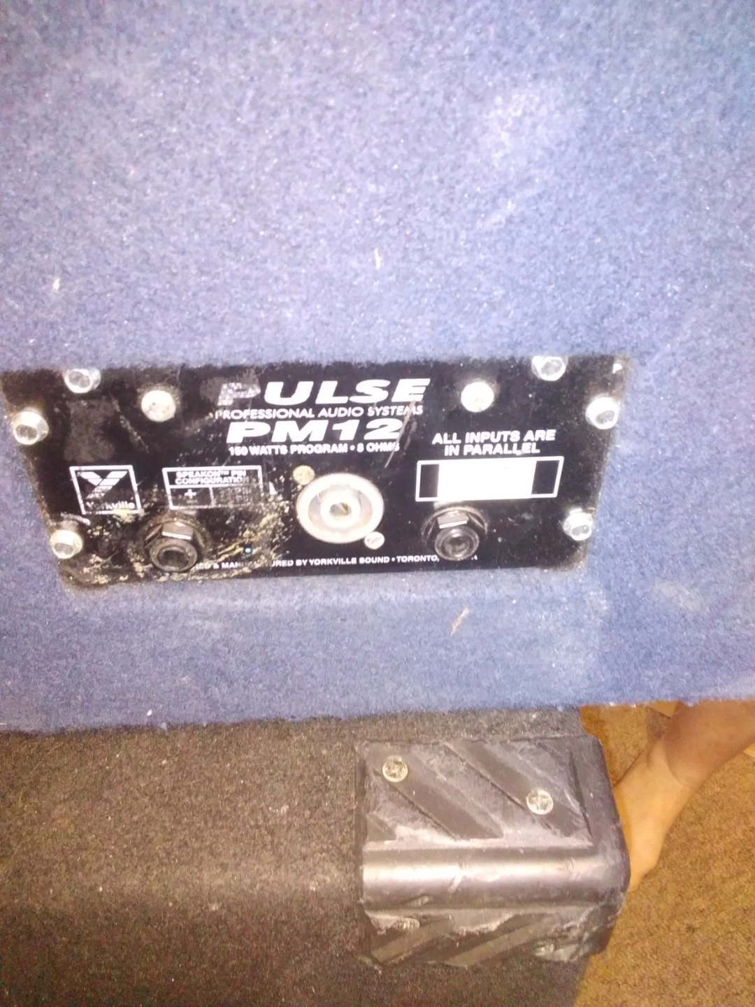 This is a Pulse PM12 professional audio speaker. It's rated for 150 watts program and 8 ohms. All inputs are in parallel.