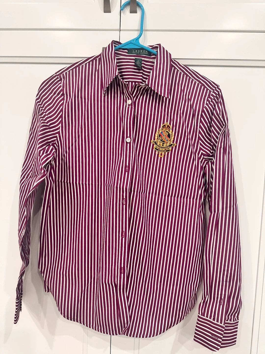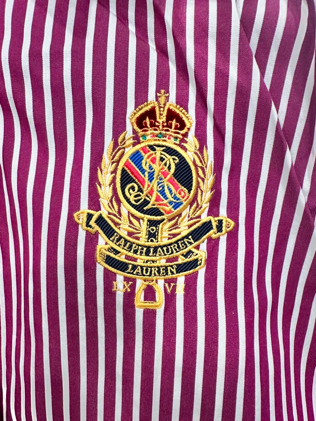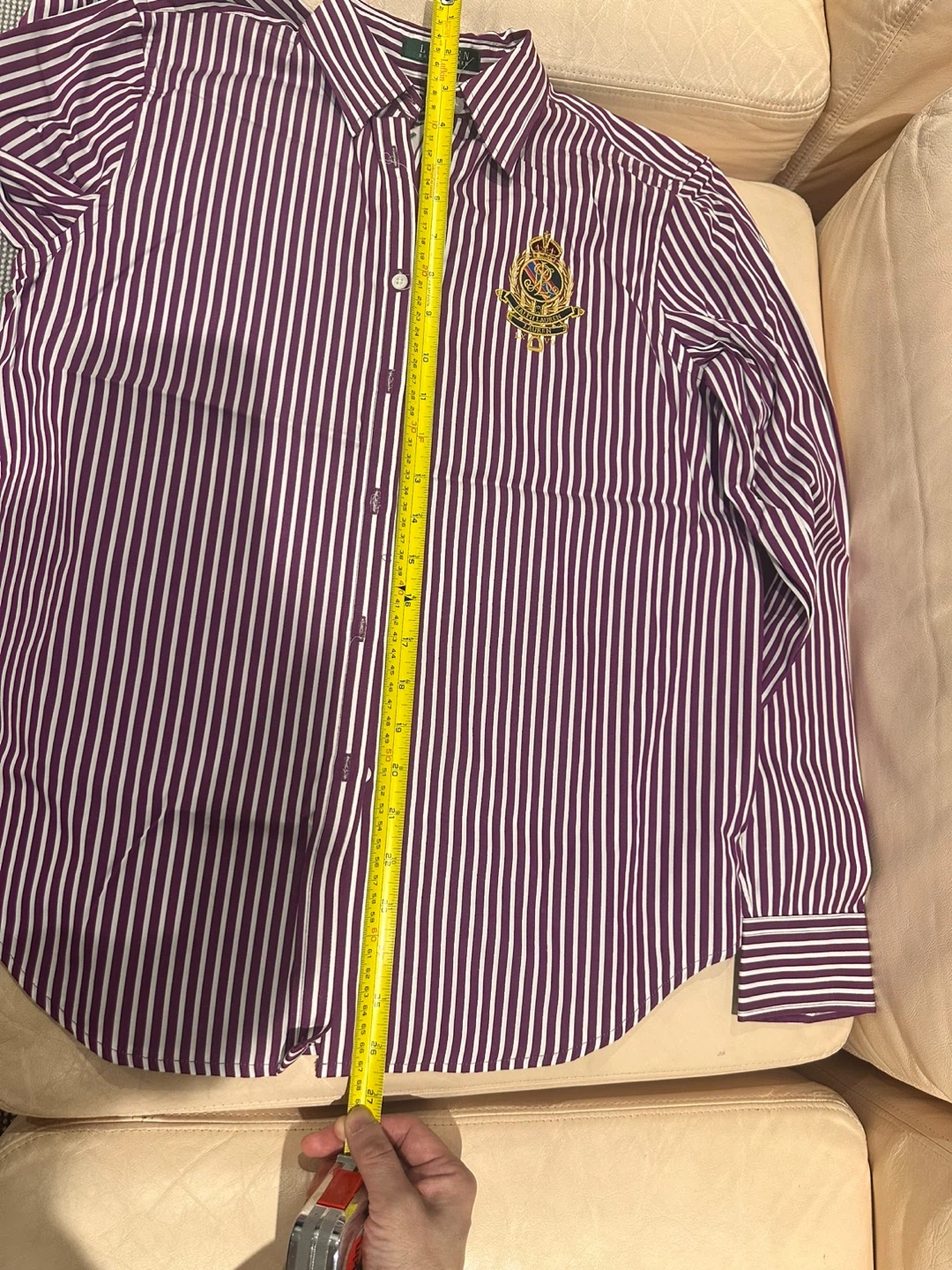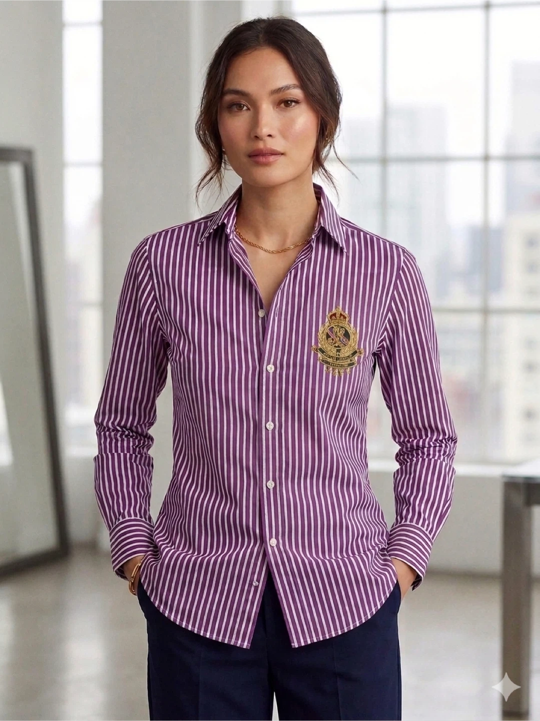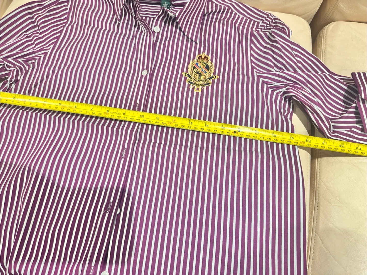 A classic Ralph Lauren button-up shirt with a purple and white stripe pattern. It features the Ralph Lauren crest embroidered on the chest. Button closure and long sleeves.