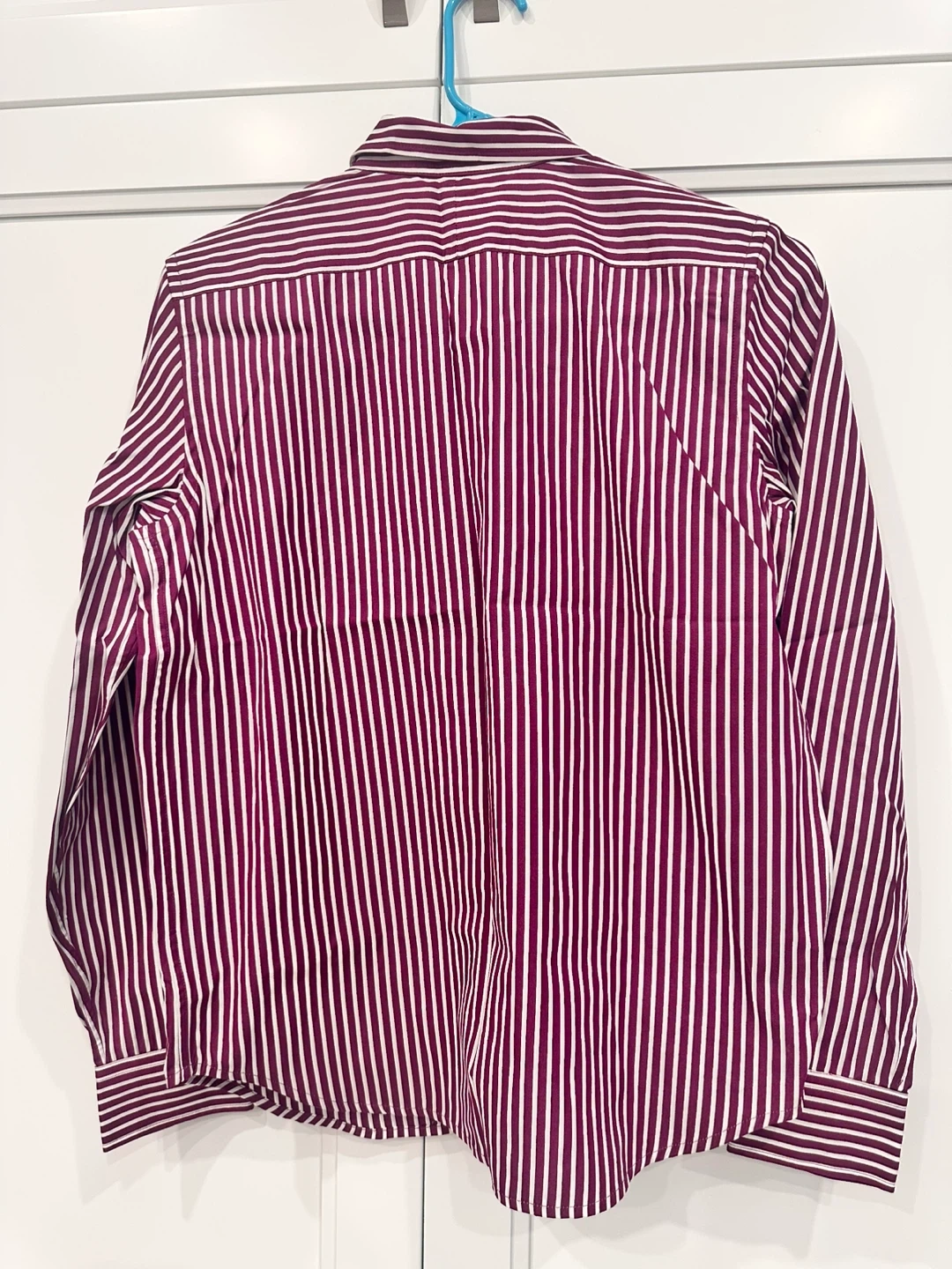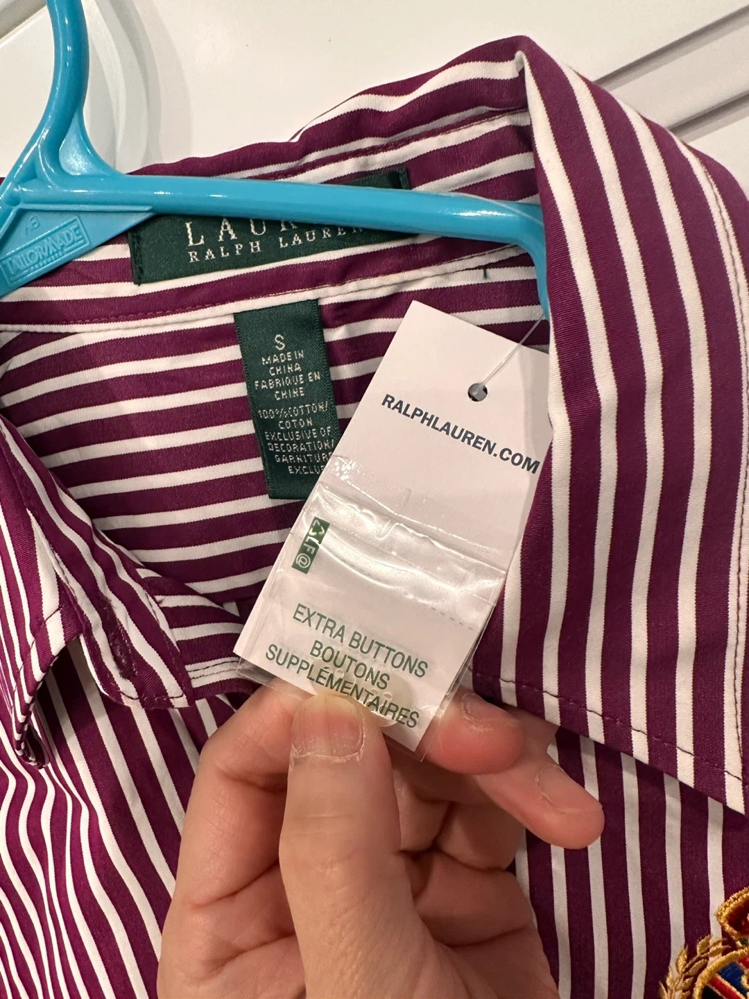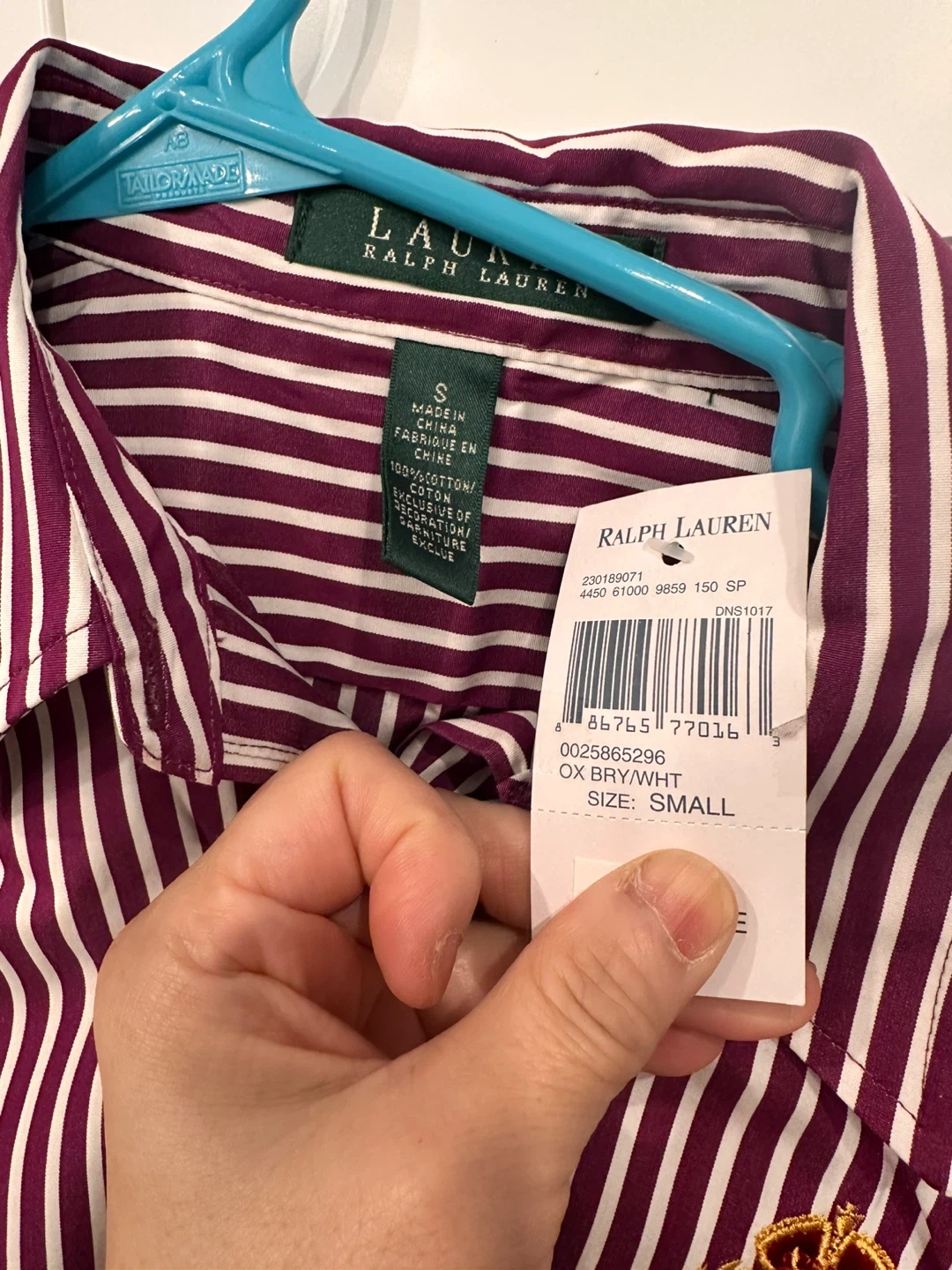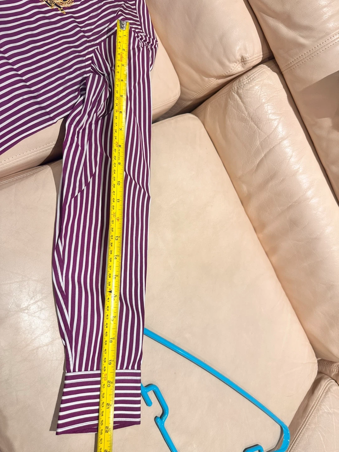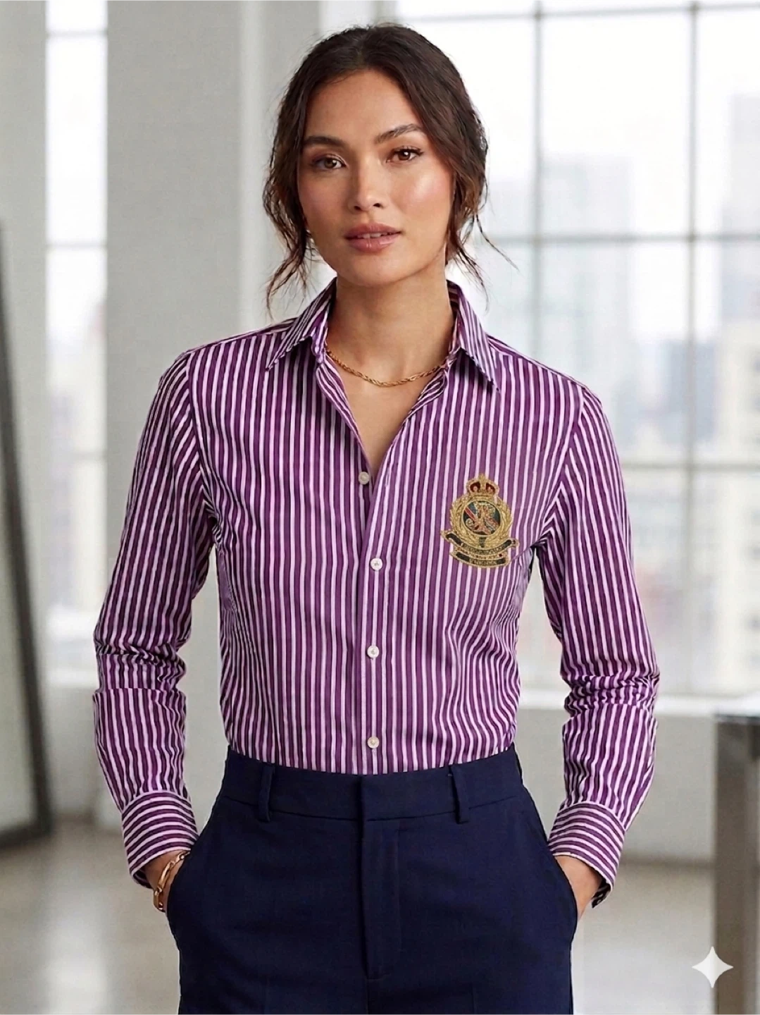 A classic Ralph Lauren button-up shirt with a purple and white stripe pattern. It features the Ralph Lauren crest embroidered on the chest. Button closure and long sleeves.
