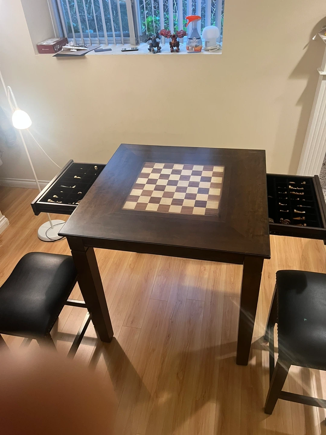 This wooden table features a built-in chessboard on top. It has a drawer for storing game pieces and comes with two chairs. Table dimensions: 91.5 x 91.5 x 91 cm.Chair dimensions: 35x48 x 60cm. 1 table & 2 stools. Used several times since. Scratches on it.
