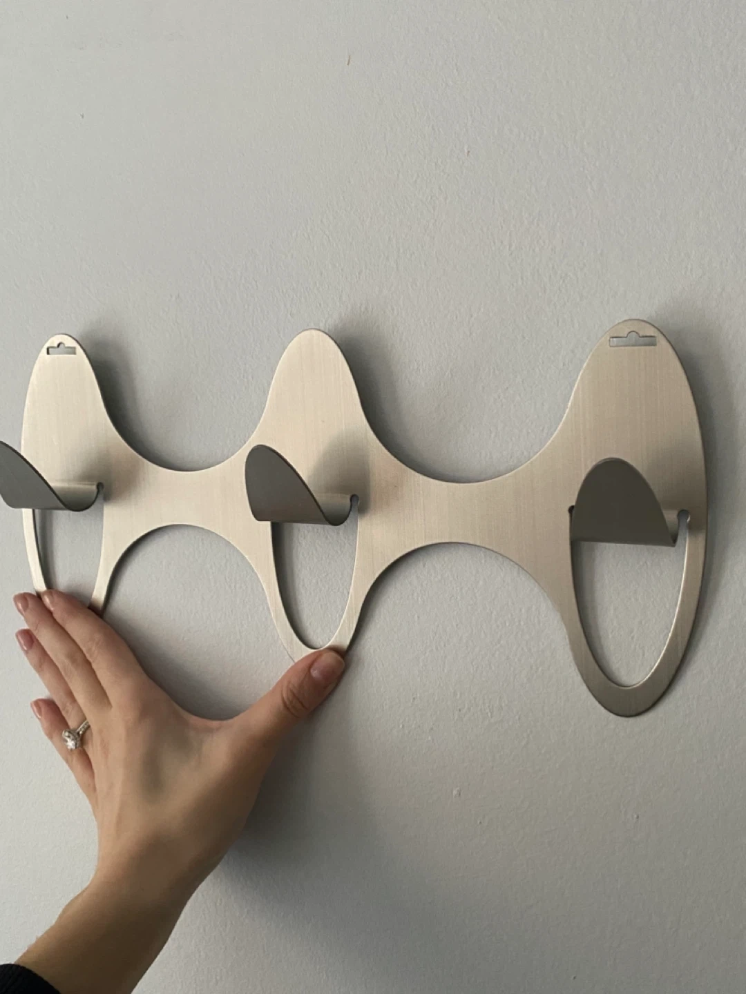The design is intended to be both functional and sculptural; when nothing is hanging on it, it looks like a piece of abstract wall art.
