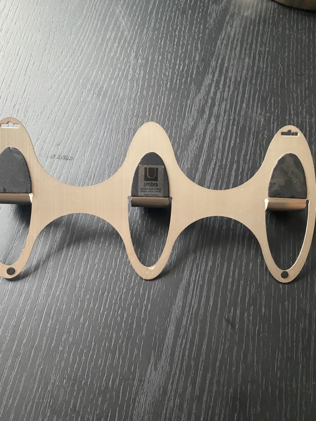 This Umbra brushed metal wall hook rack offers multiple hanging points. It's designed by William Harvey dated early to mid 2000s. It's perfect for hanging coats, bags, or hats near the entryway or magazines as shown in photo.
