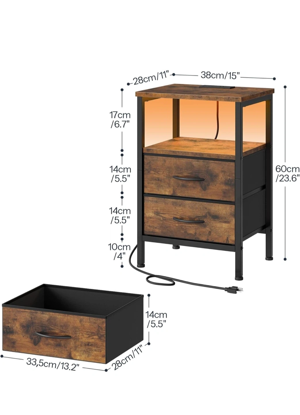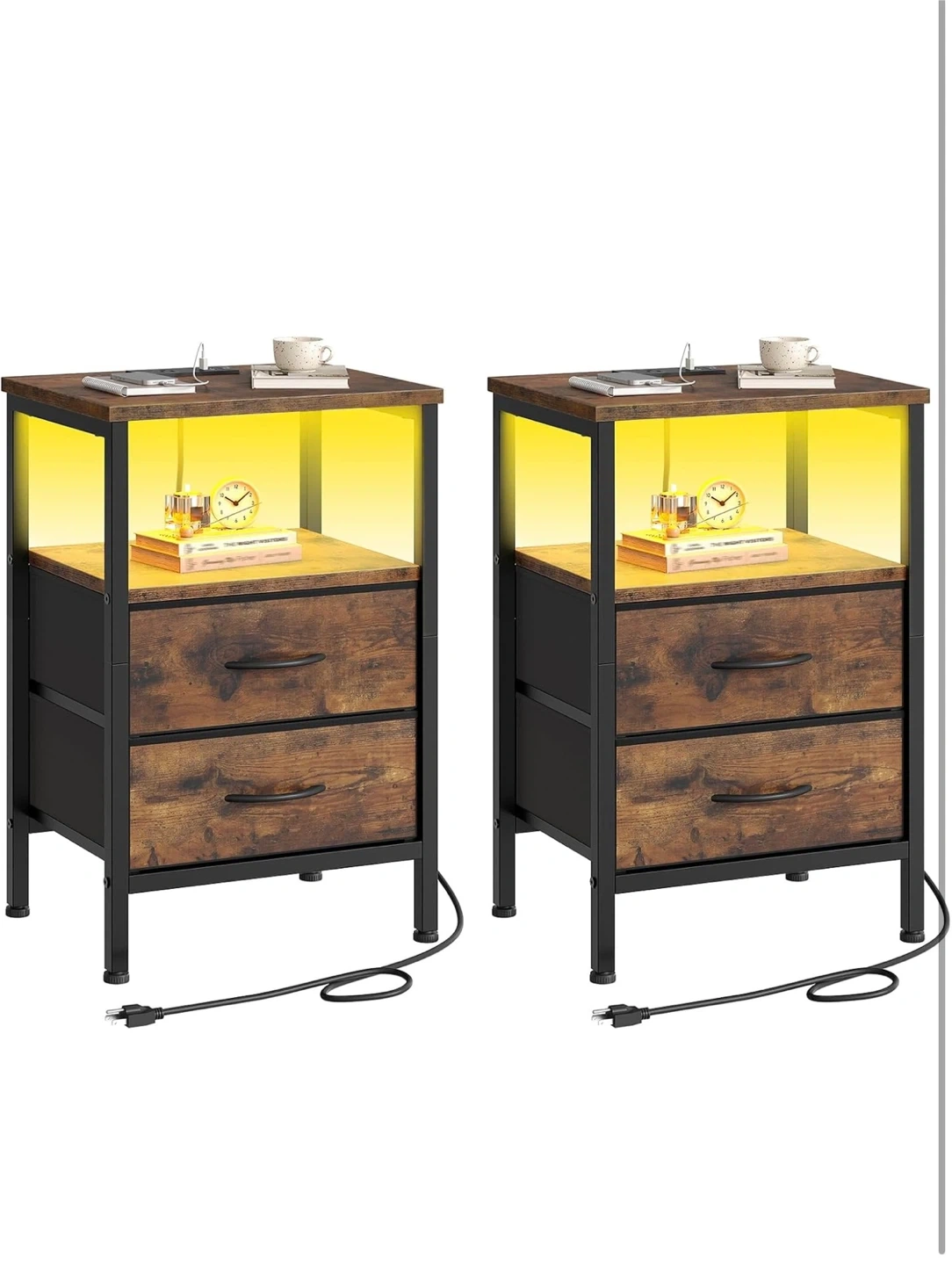 These nightstands feature a rustic wood finish and a metal frame. They come with two drawers for storage and integrated LED lighting. USB ports included for charging phones