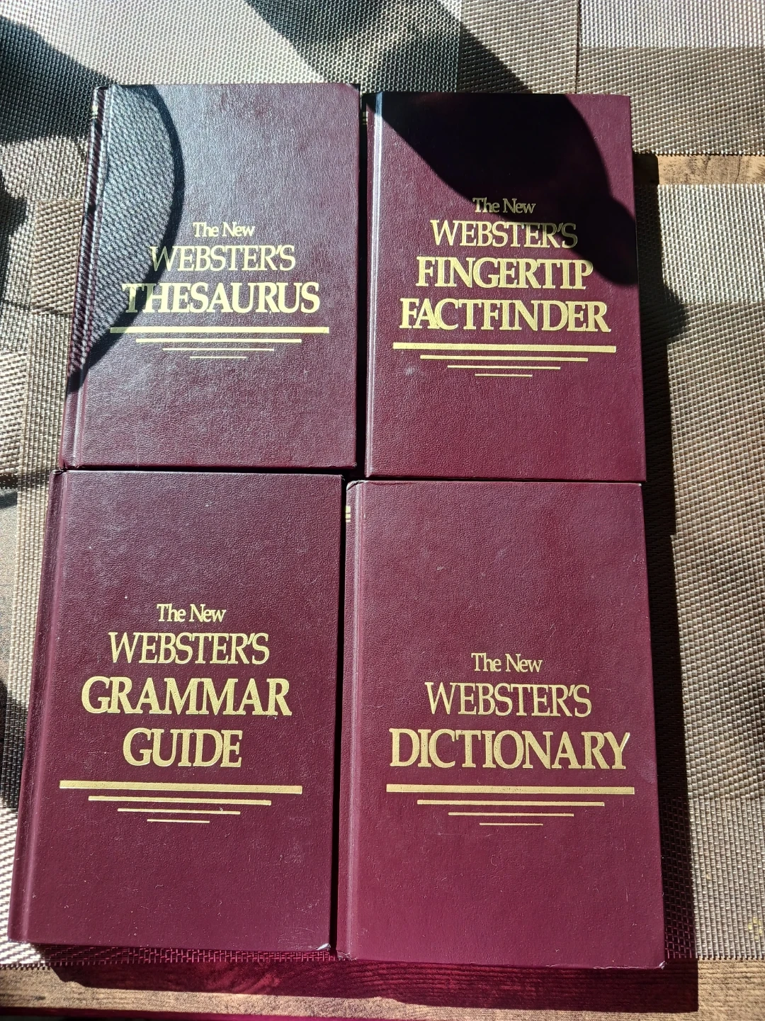 This set includes The New Webster's Thesaurus, Fingertip Factfinder, Grammar Guide, and Dictionary. They're bound in a deep burgundy colour with gold lettering. Great for students or anyone wanting to expand their vocabulary and knowledge!