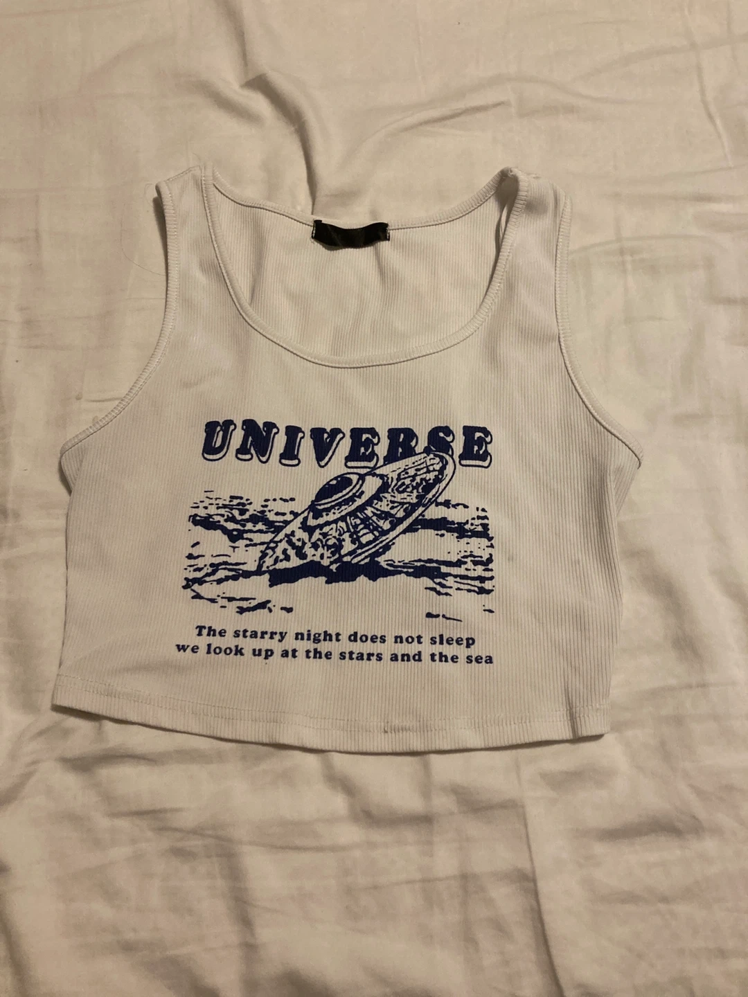 This white ribbed tank top has a "UNIVERSE" graphic with a spaceship and text. It's made of a stretchy material. Great for a casual, cosmic vibe!