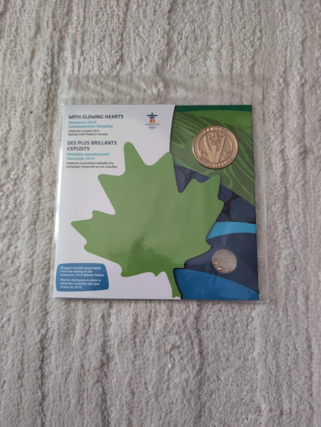 This is a gold-plated medallion celebrating the Vancouver 2010 Winter Olympics. It's made from guaranteed residual metal from the making of the Vancouver 2010 athlete medals. It features a gold-plated sterling silver nugget.