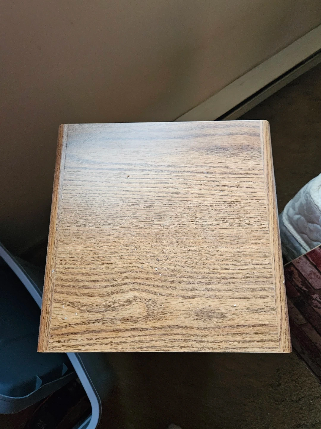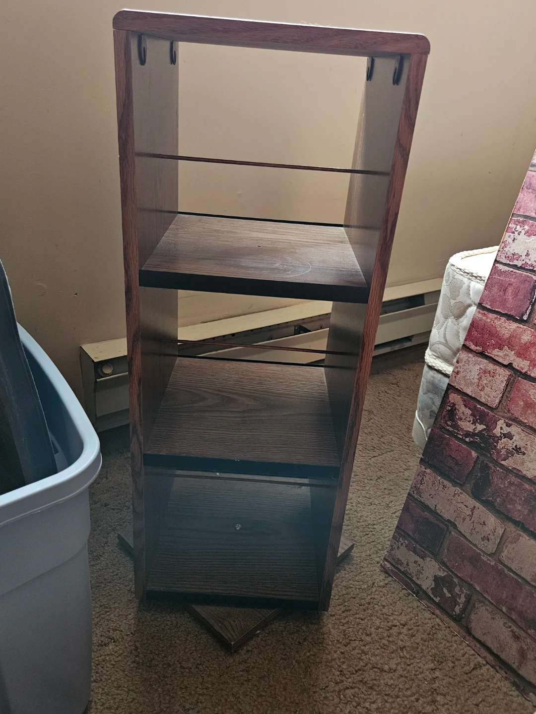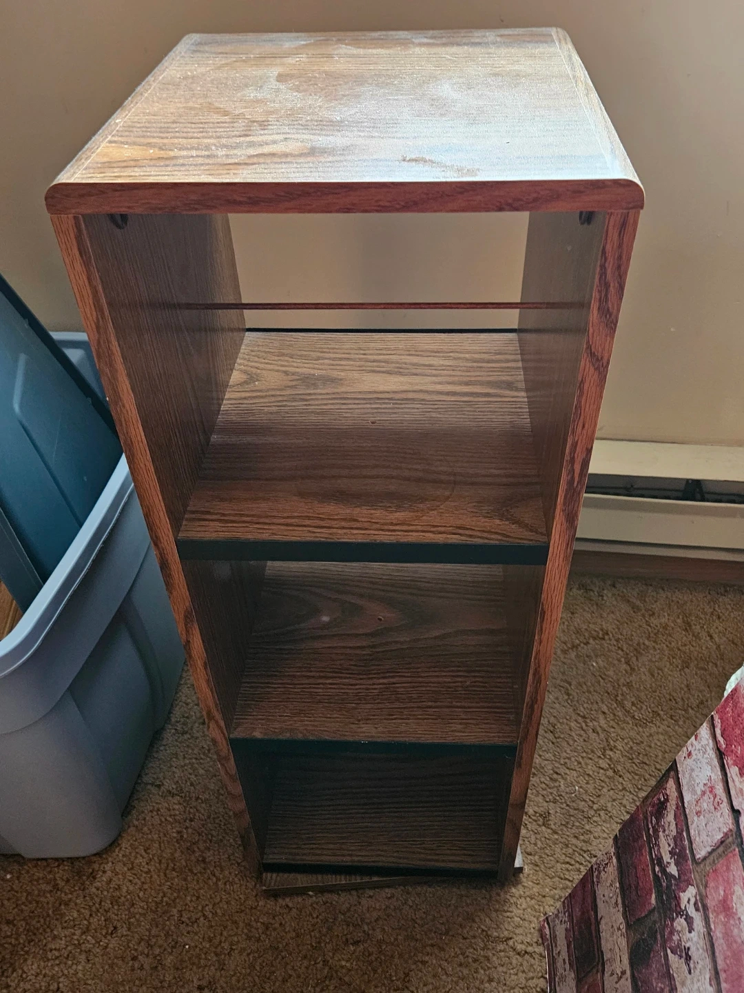Here's a wooden shelf unit, perfect for displaying items or storing books. It has three shelves and a sturdy design. It's in good condition and ready for a new home!