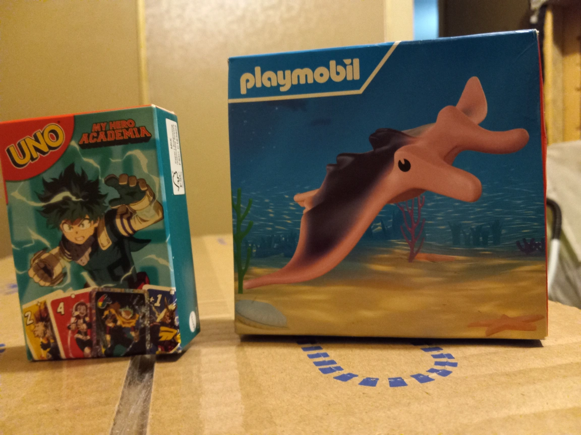 Includes UNO card game featuring My Hero Academia characters. Also includes a Playmobil set with a sea creature and underwater scene. Both are new in box.