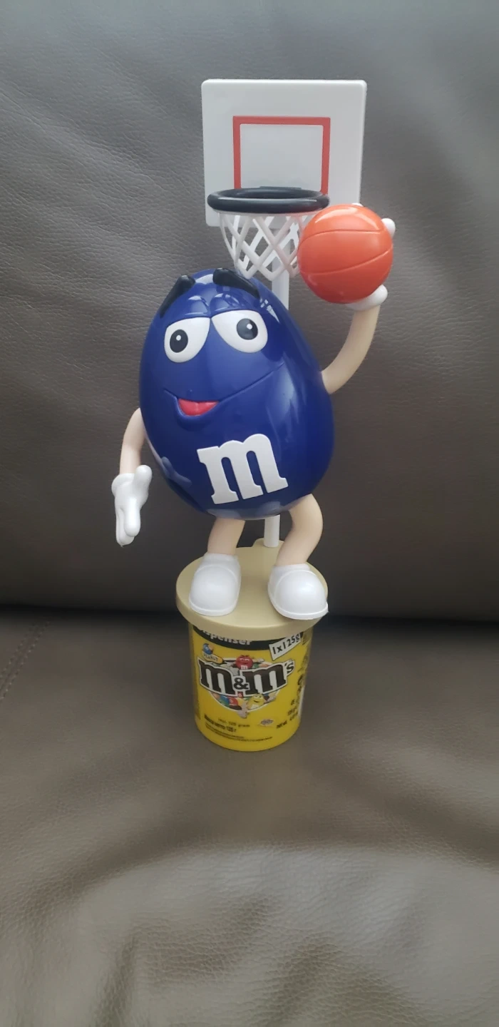 This M&M's dispenser features a blue M&M character dunking a basketball. It comes with a 25g pack of M&M's. It's a fun collectible for fans! Its also a despenser, move the basketball and the hole opens at the bottom.